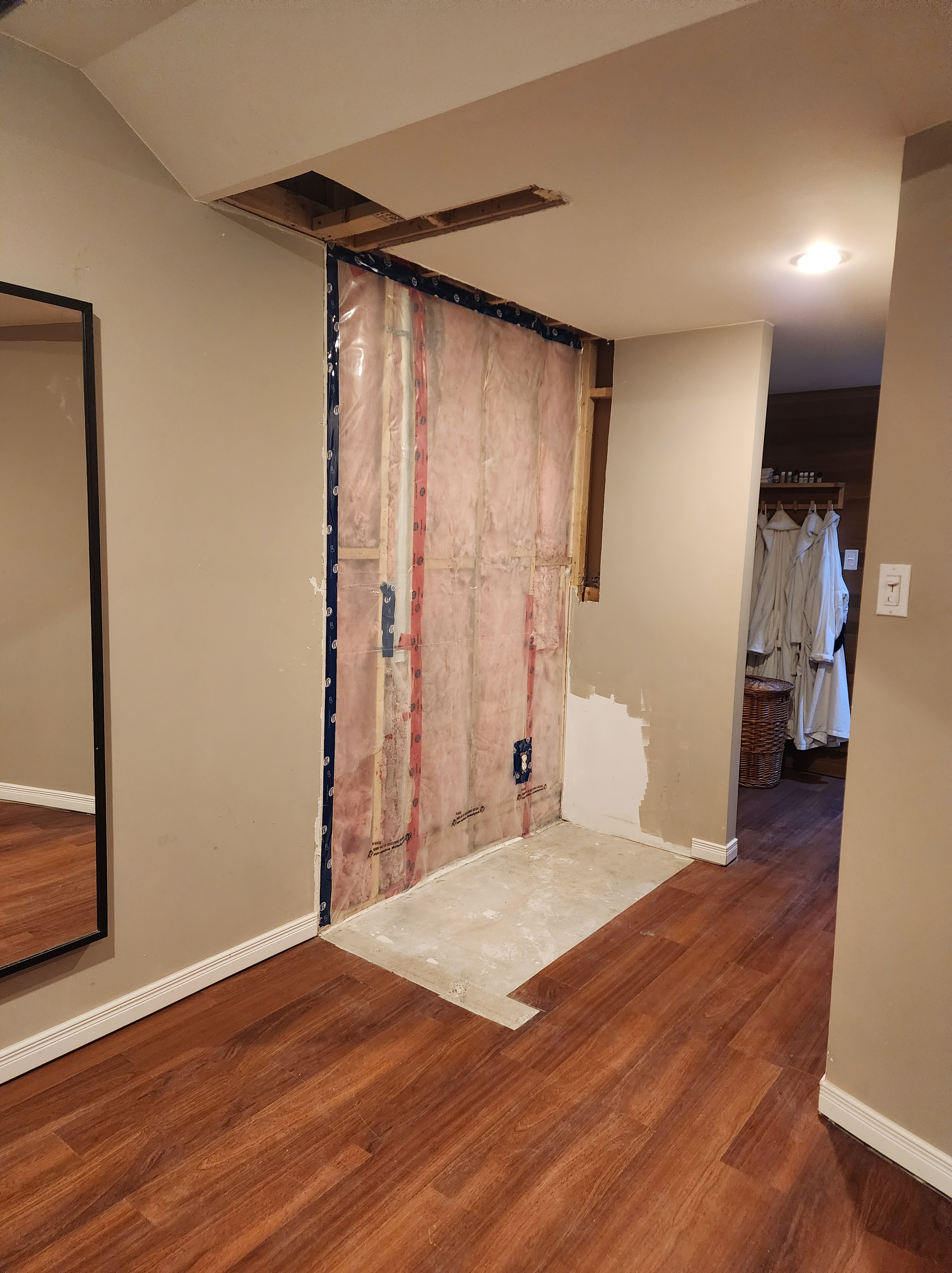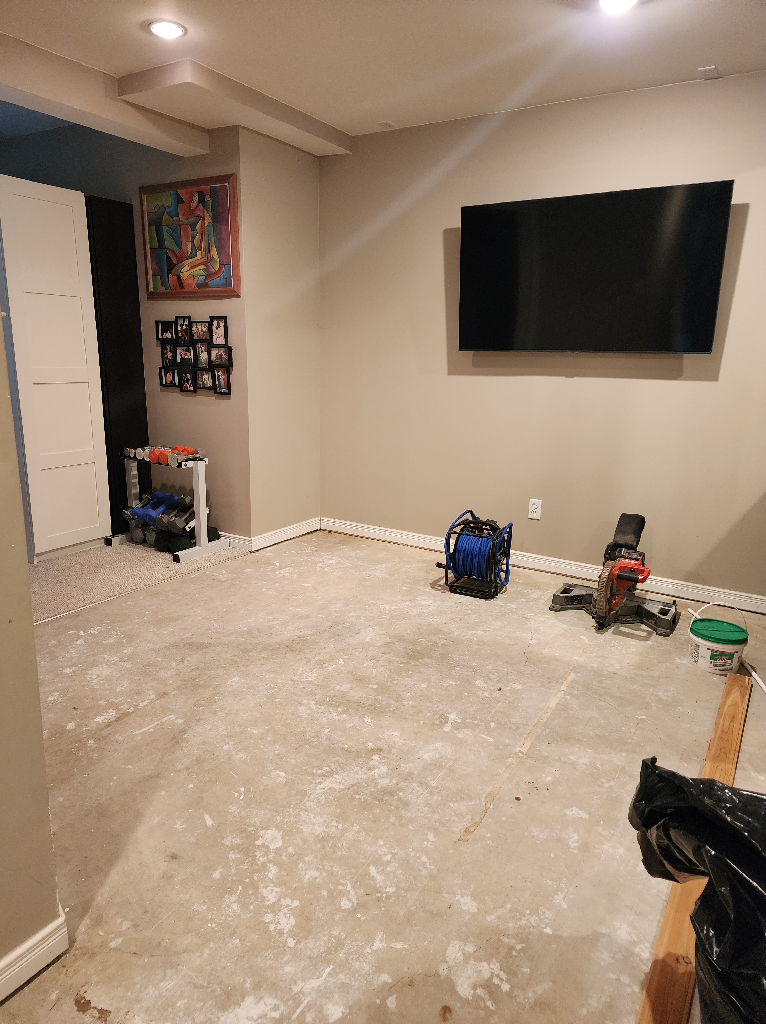 Originally, the laundry machines were older side by side units located in the basement, next to their home gym. With the new machines now up in the bathroom on the second floor, we were able to use the space where they were to enlarge the gym area. We took out the wall that separated the laundry machines from the gym, patched and painted it and removed the old flooring.