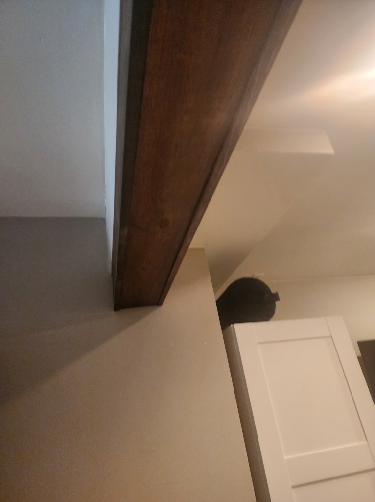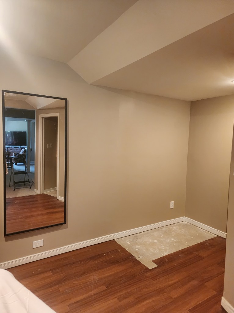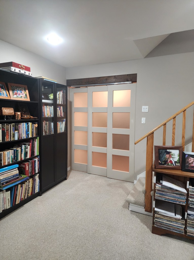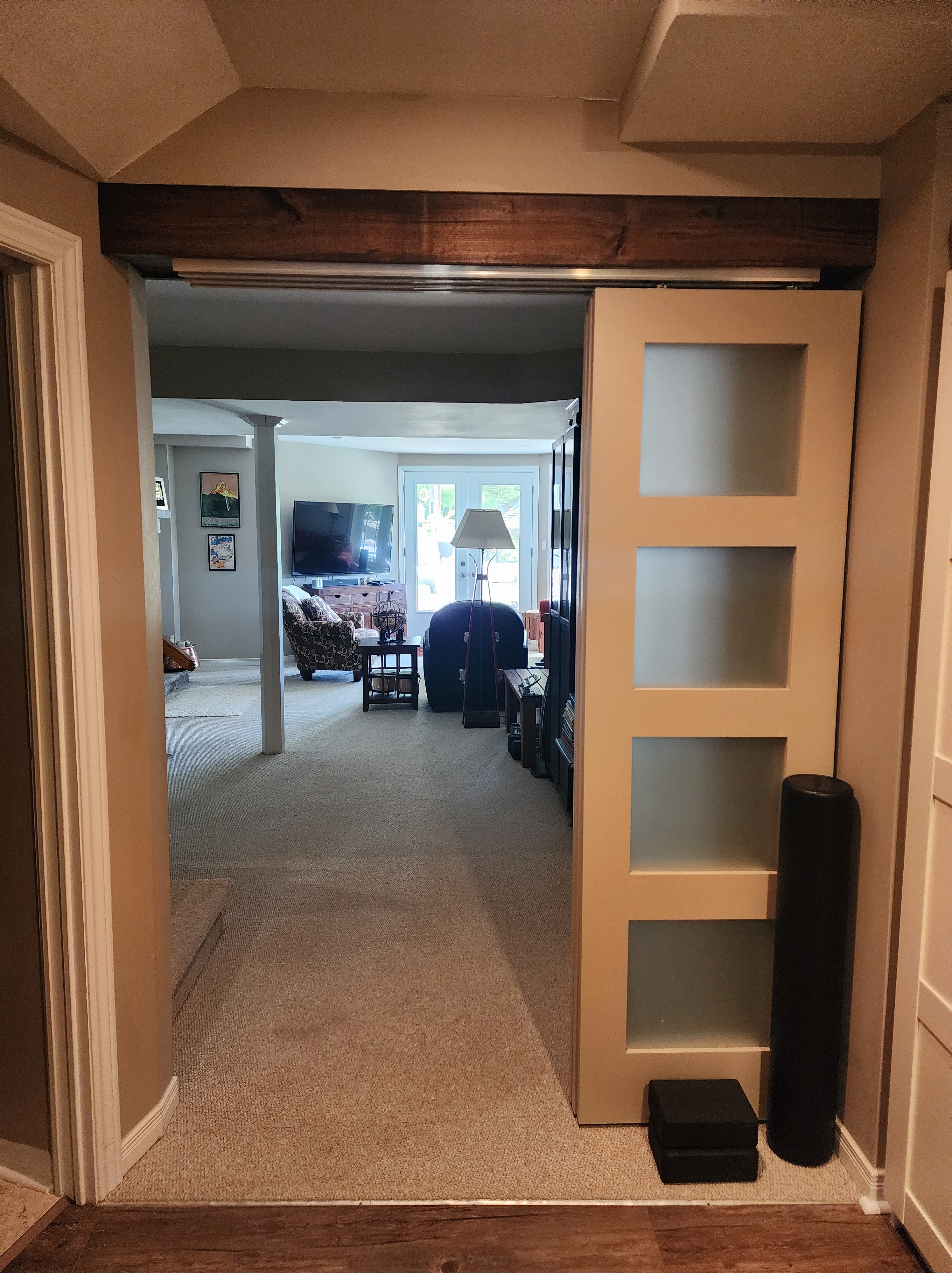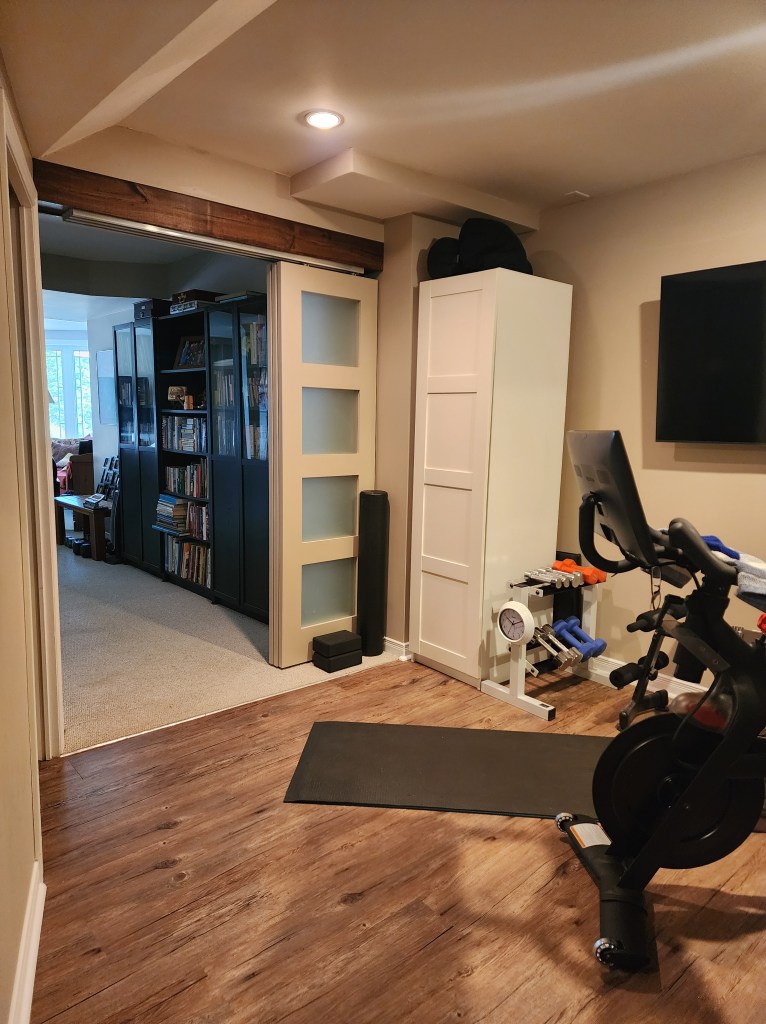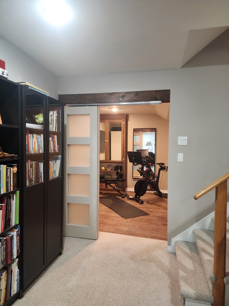 Finally we added stacking doors to separate the gym from the rest of the basement. Due to the height of the ceiling and the length of the doors, we made a beam from knotty pine and attached the door rail to that, so the doors wouldn’t sit too high off of the floor. The doors were then painted in the same colour as the basement walls: