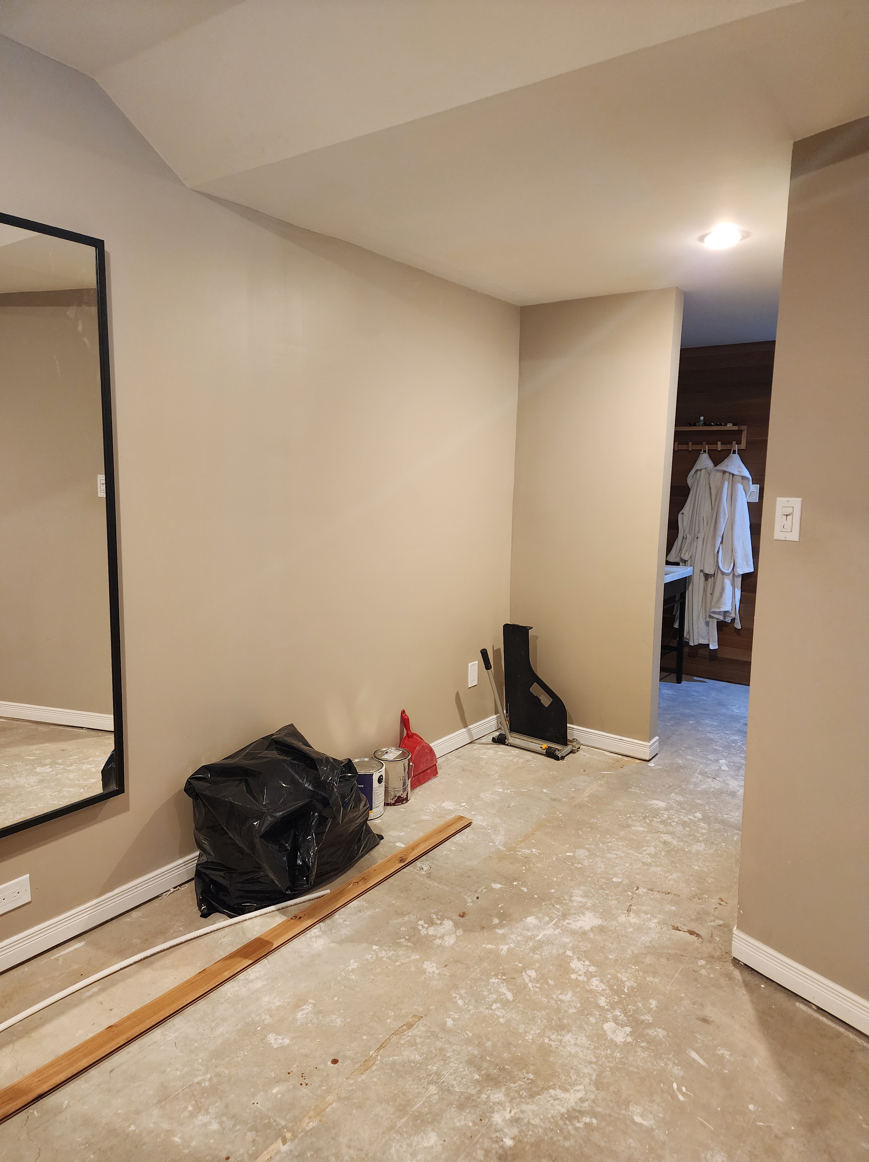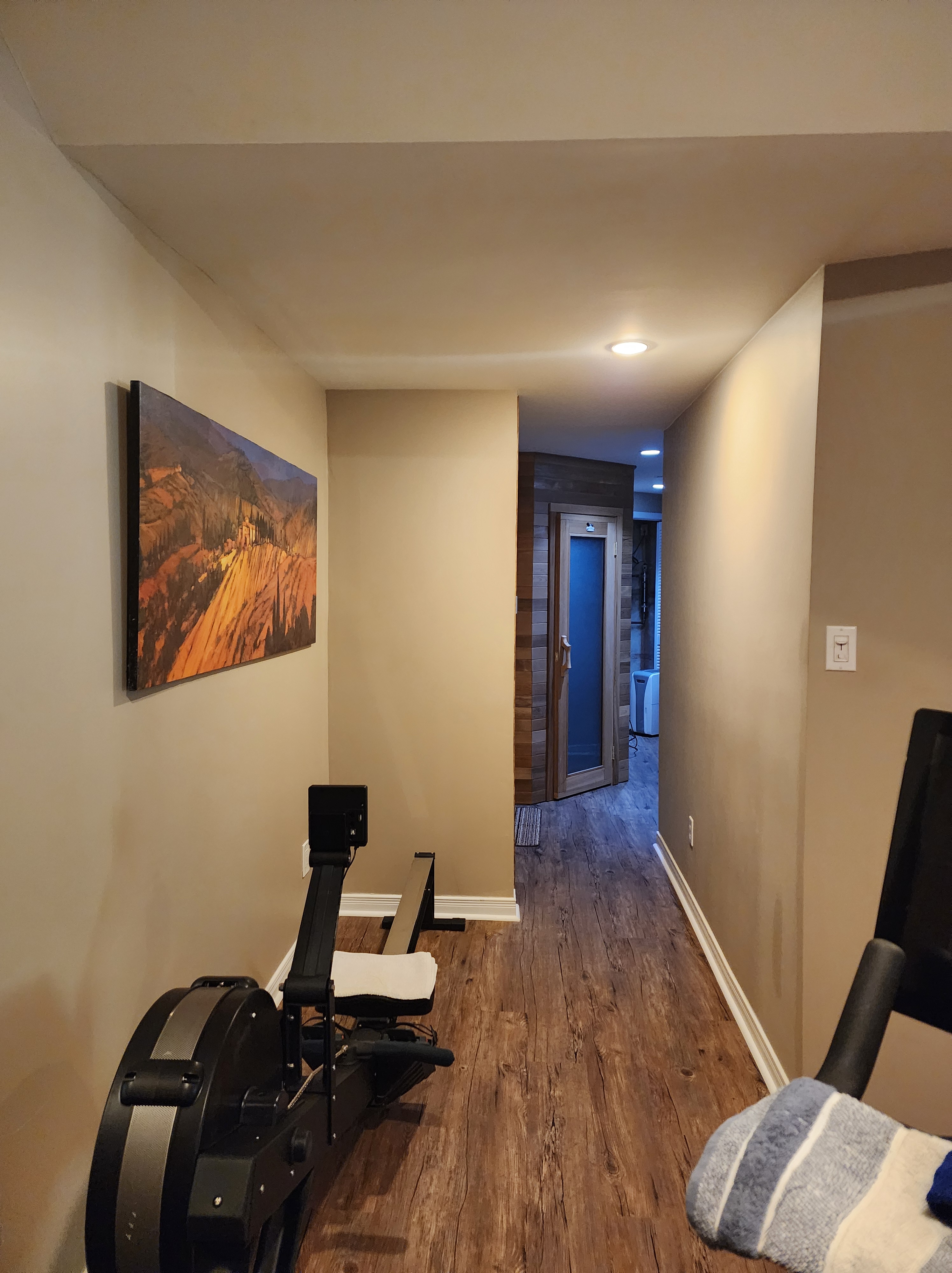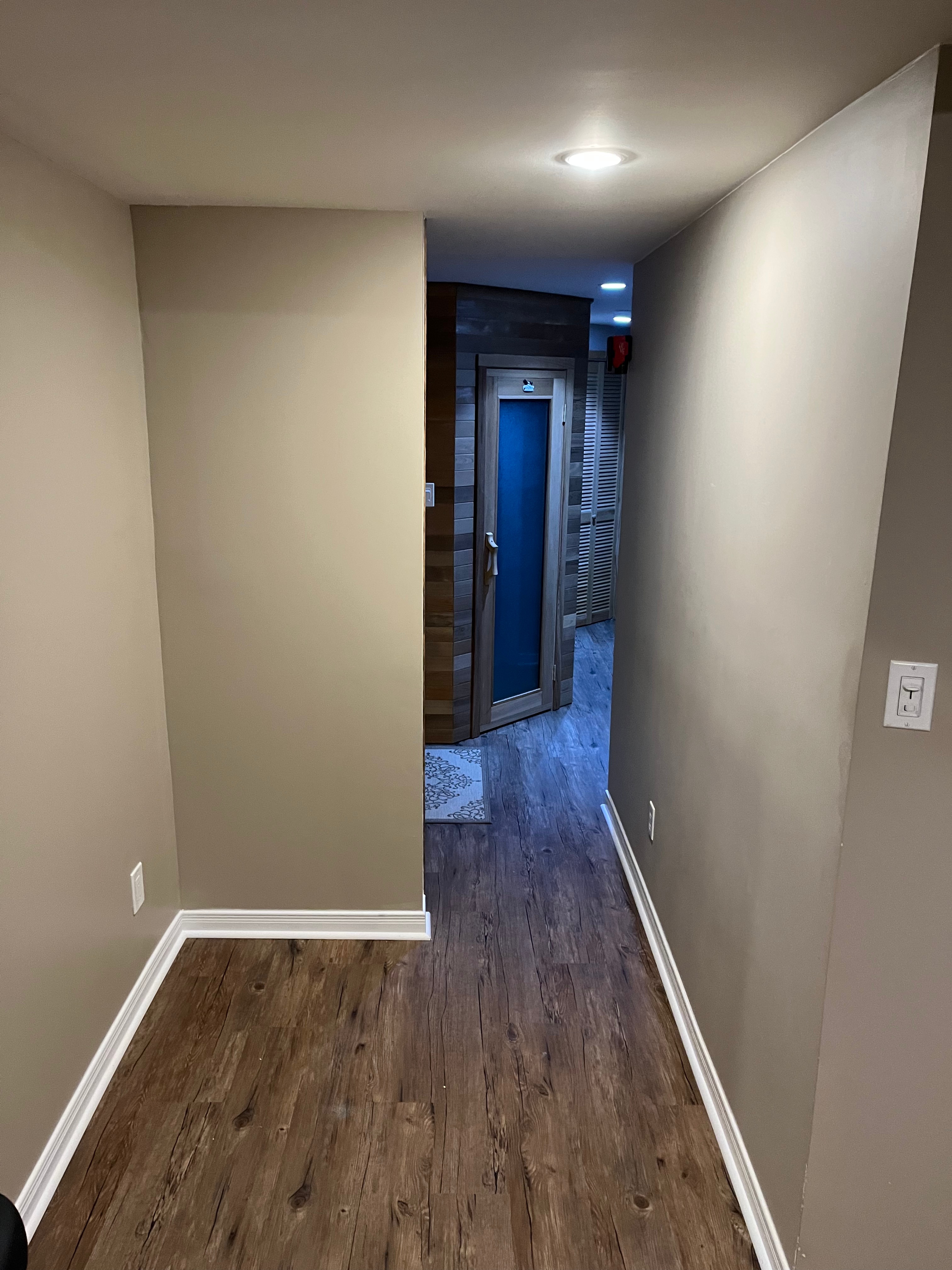 We then installed all new flooring throughout the gym and sauna areas and the hallway that leads around to the furnace room: