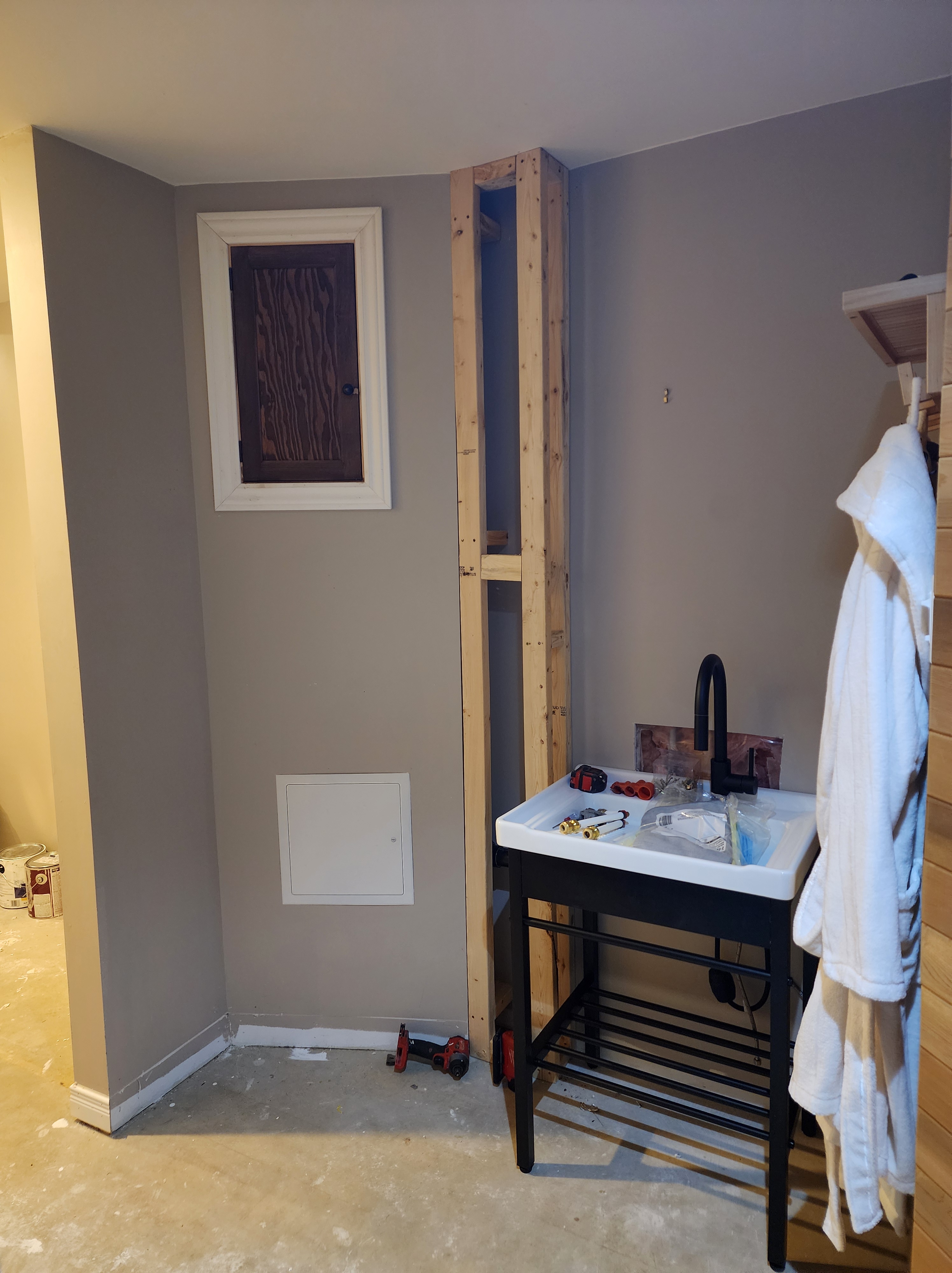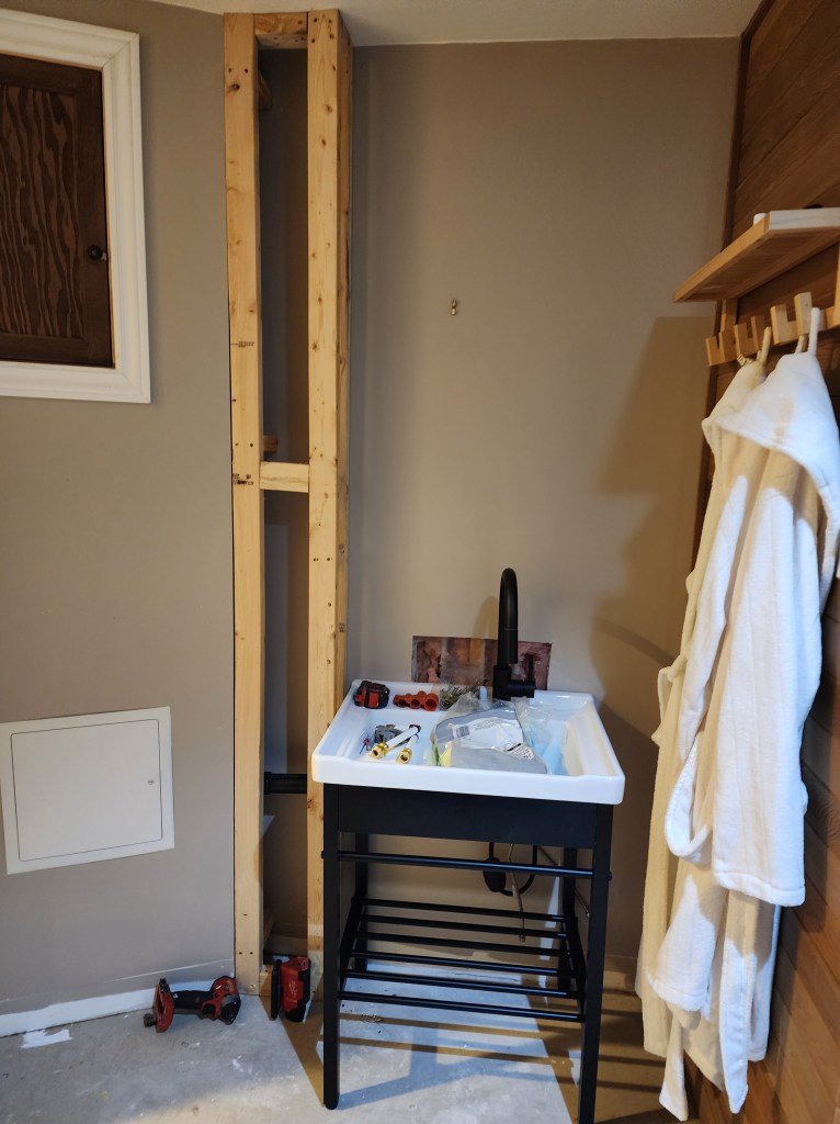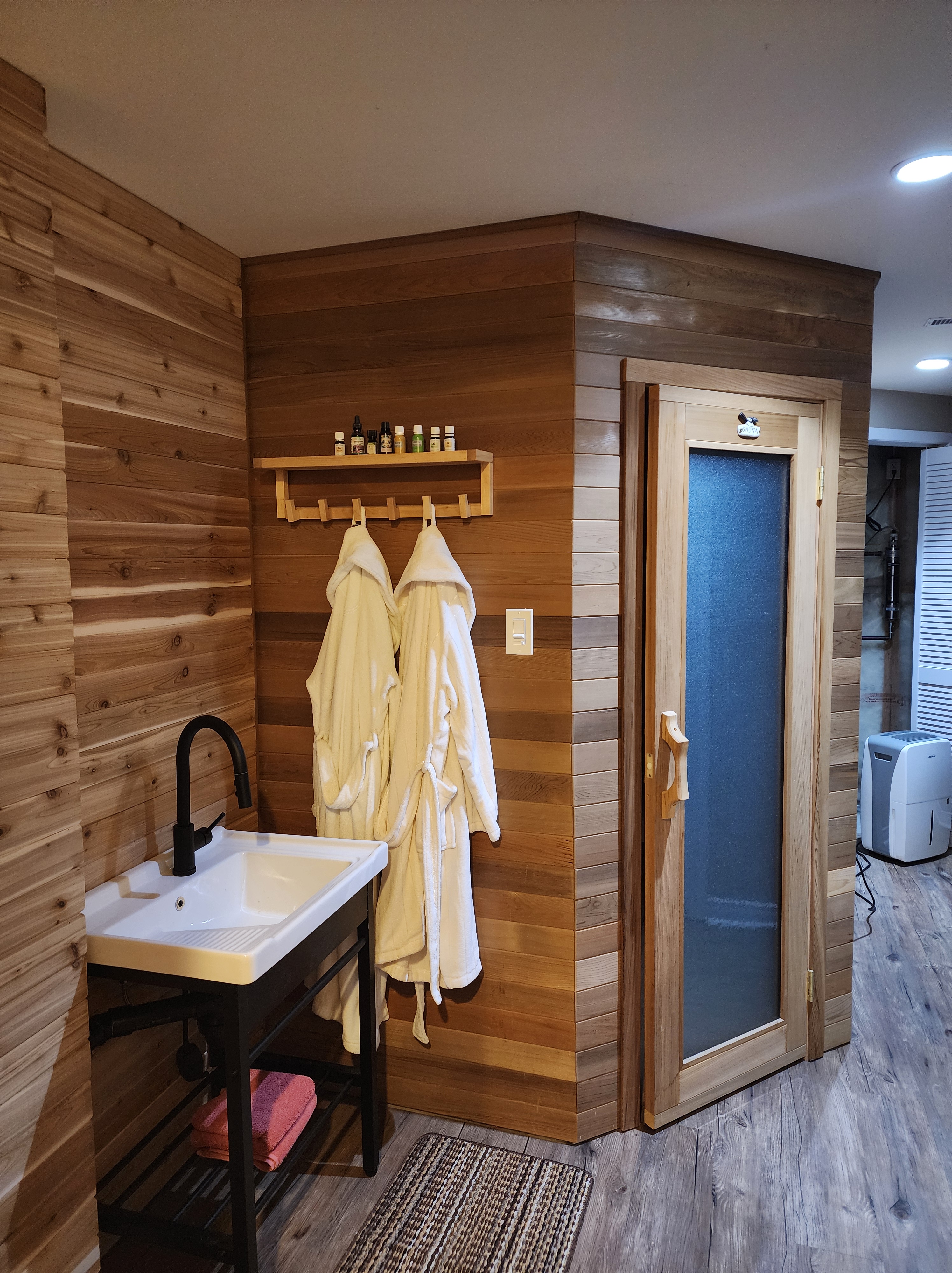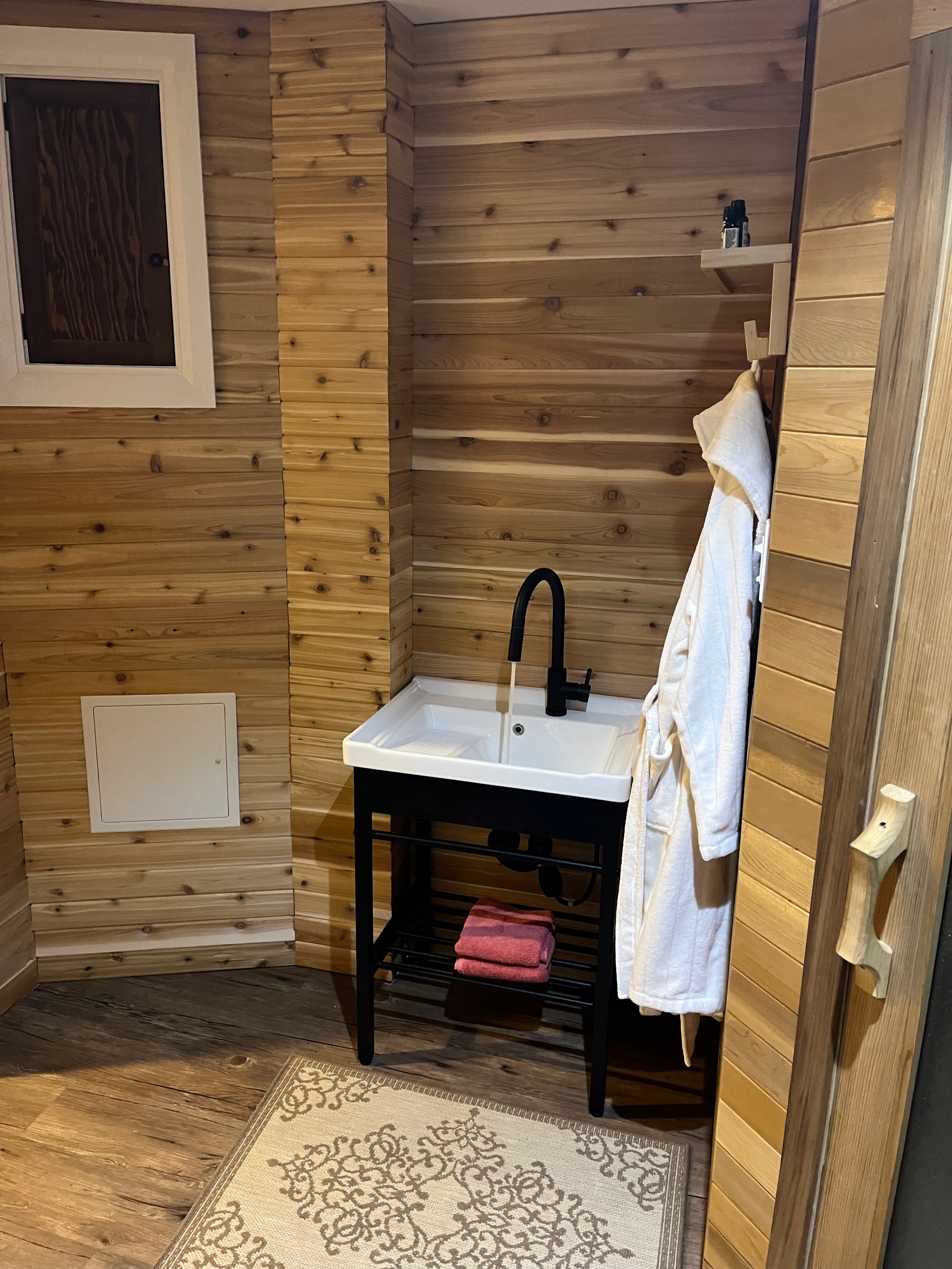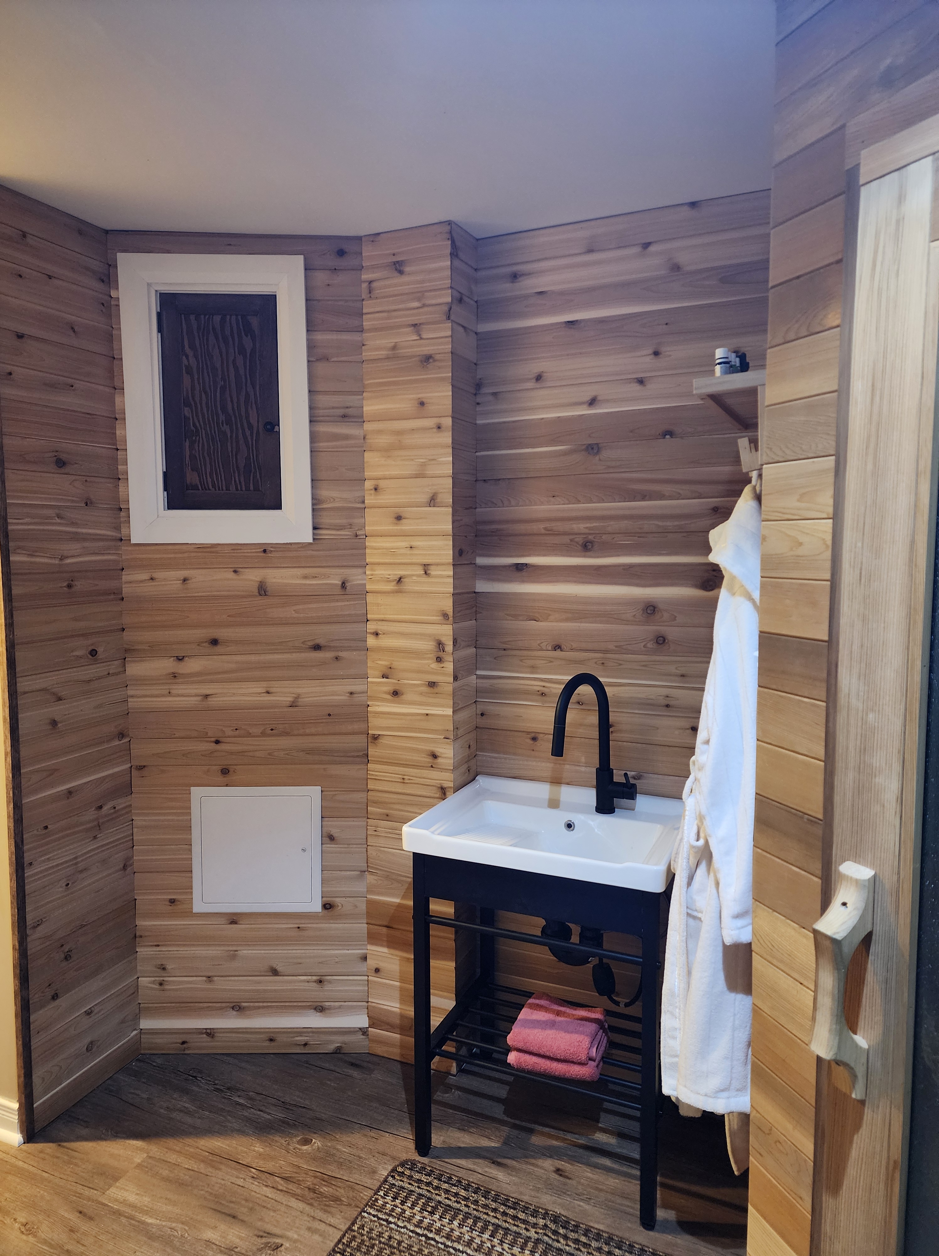 In the sauna area, we cut and installed tongue and groove cedar planks on the wall to help define the sauna area. We also installed a sink and faucet to make filling water bottles more convenient: