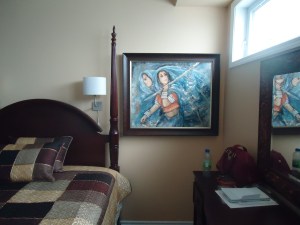 The colour of the wall can dramatically affect which colours in the art work stand out. You’ll notice in this photo, the teal wall really brings out the blue tones in the painting.