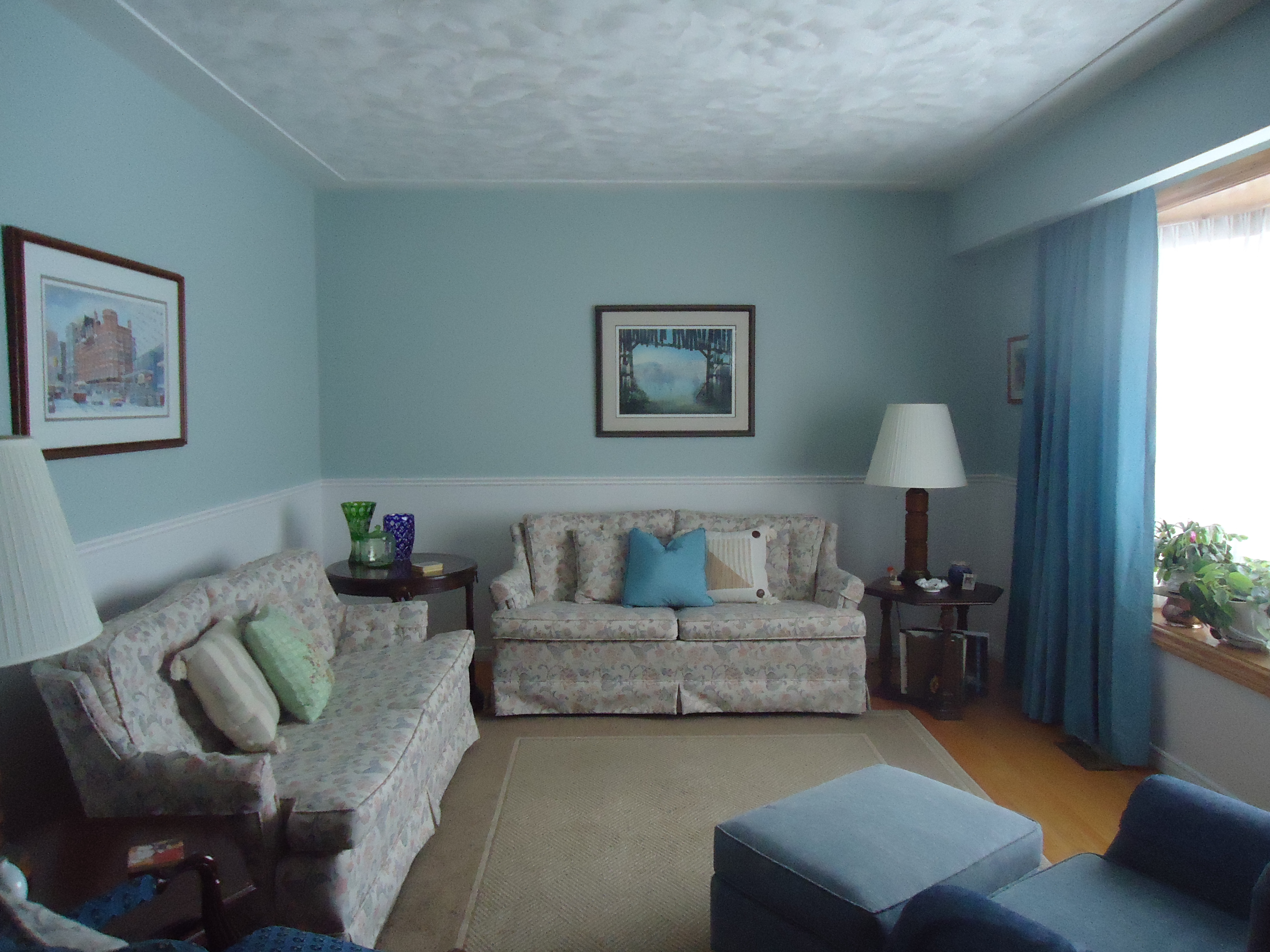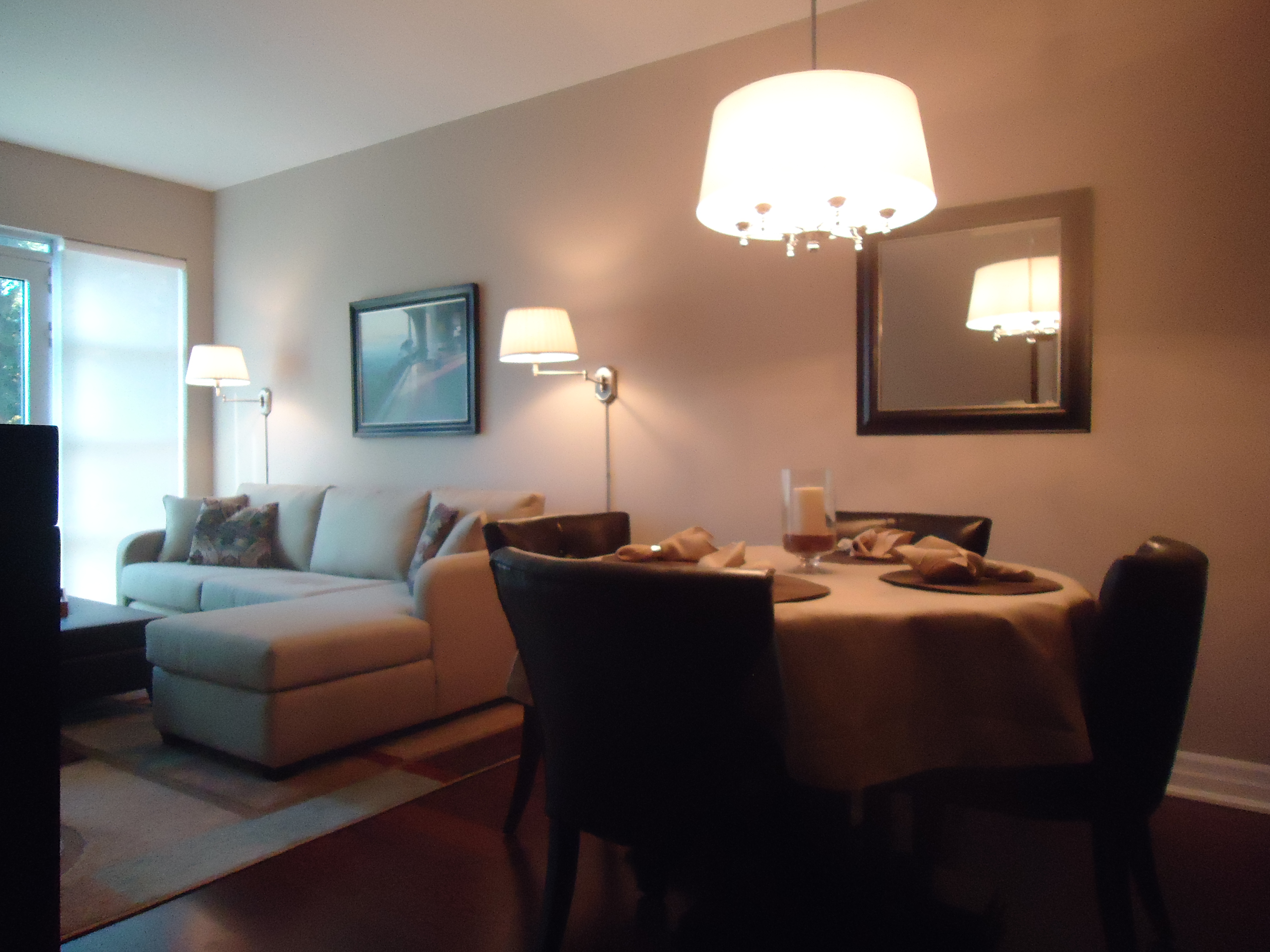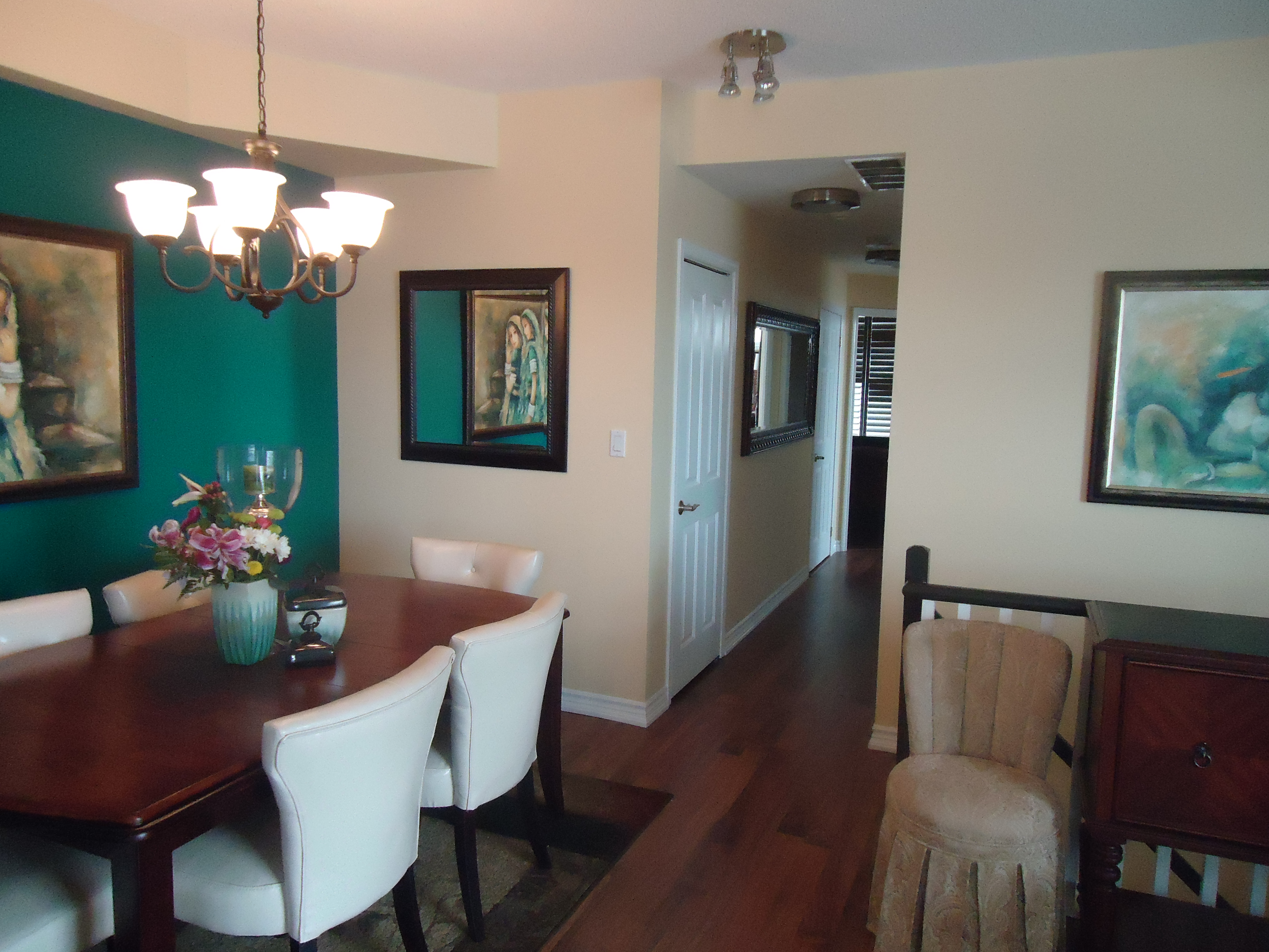 Choose one piece for each wall as a focal point and don’t hang multiple pieces together unless they are part of a grouping. If you are doing a grouping, the centre of the group should be 60″ above the floor. If you have a long wall, use one piece of art and perhaps a mirror. You don’t want your art competing for attention.