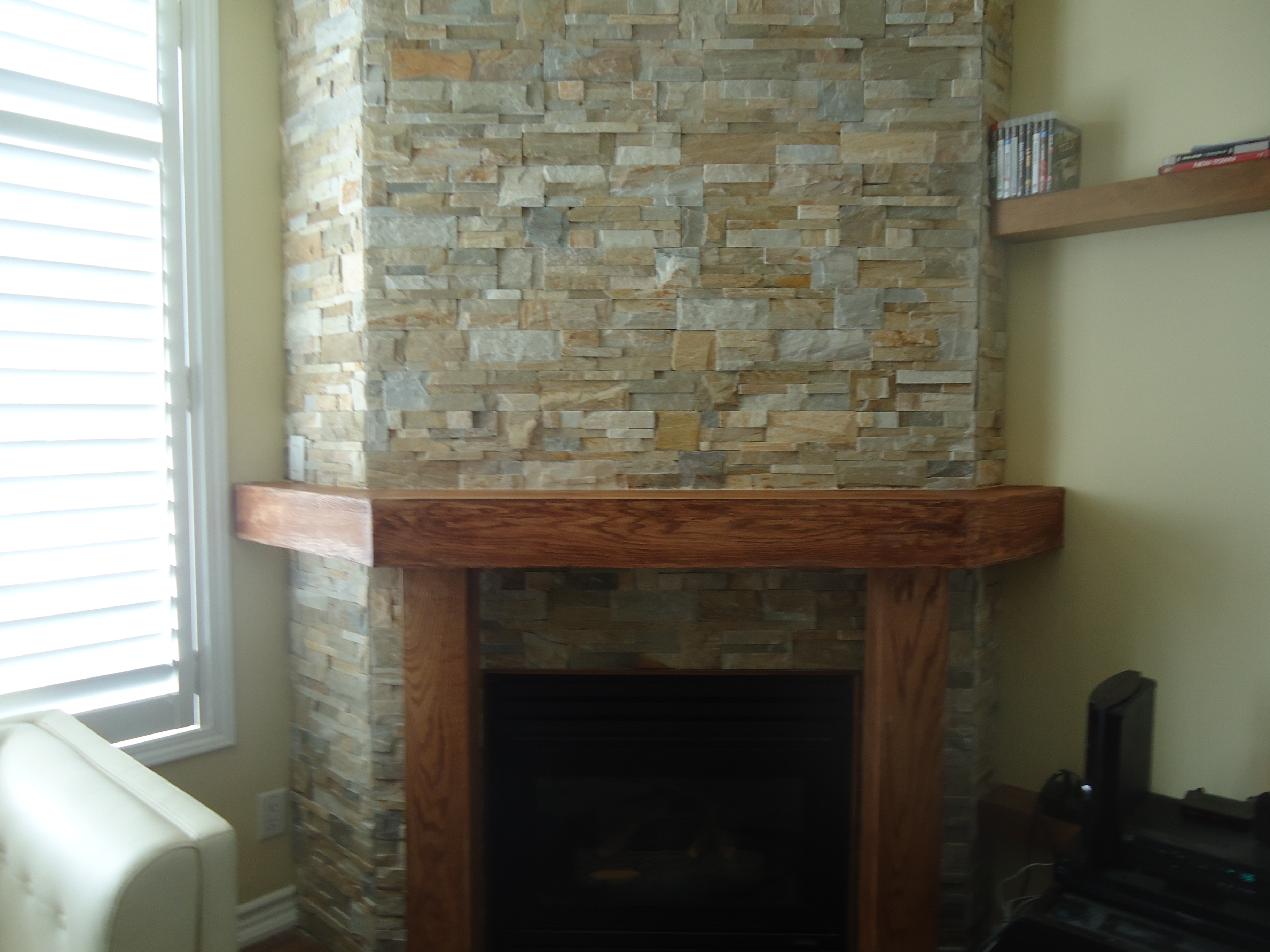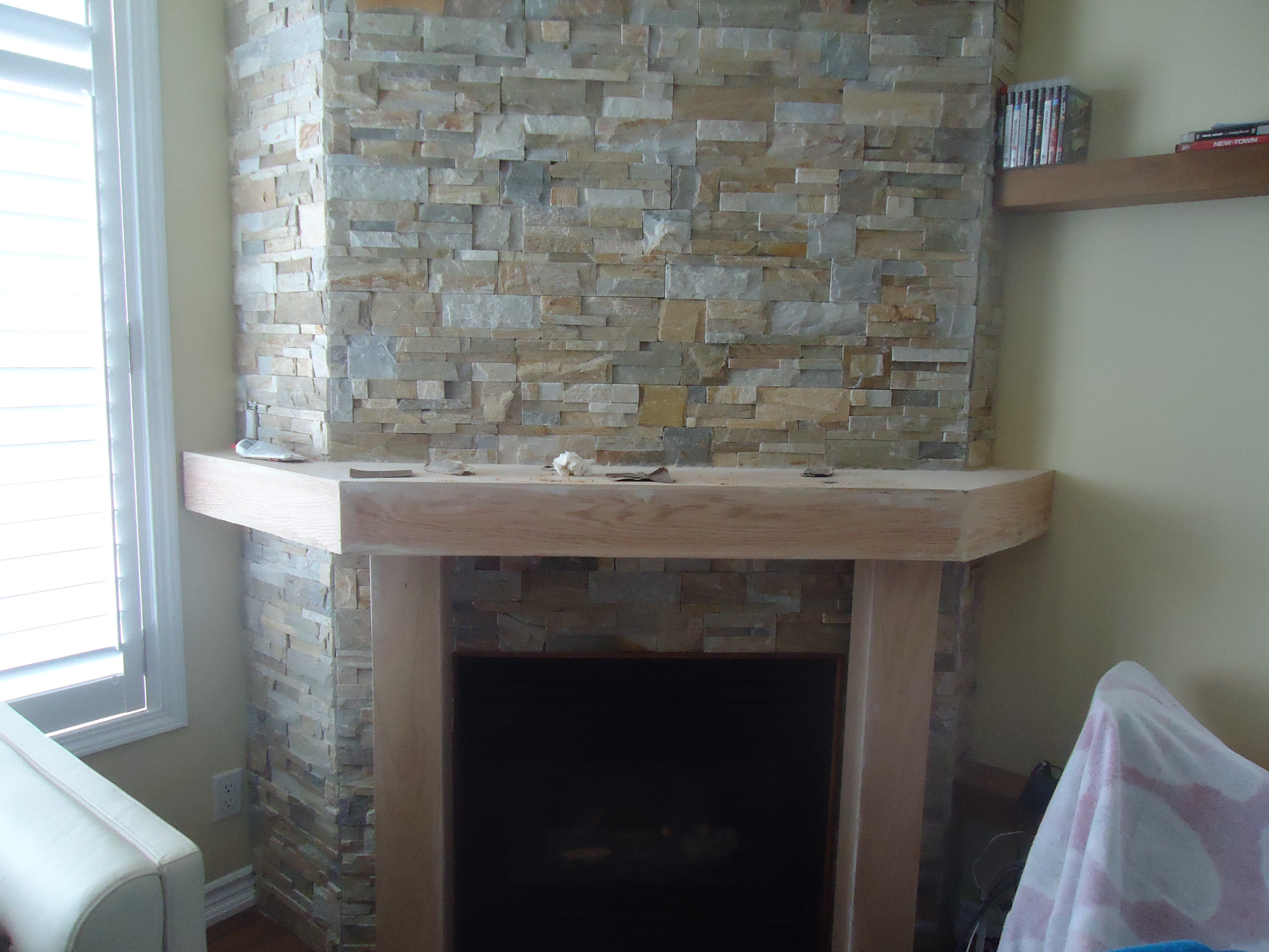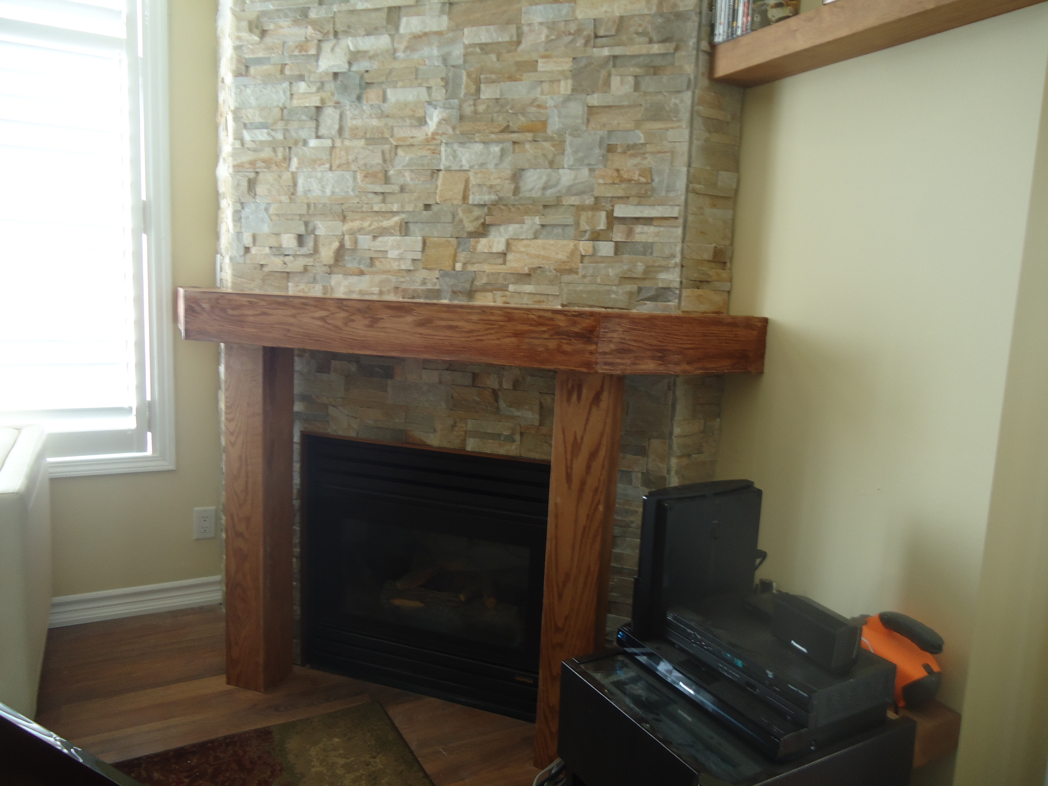 We considered the option of simply sitting the TV on the mantle. Of course, the mantle was too narrow, so a shelf had to be added with two dowels for support. A reasonable temporary fix, although not overly attractive.