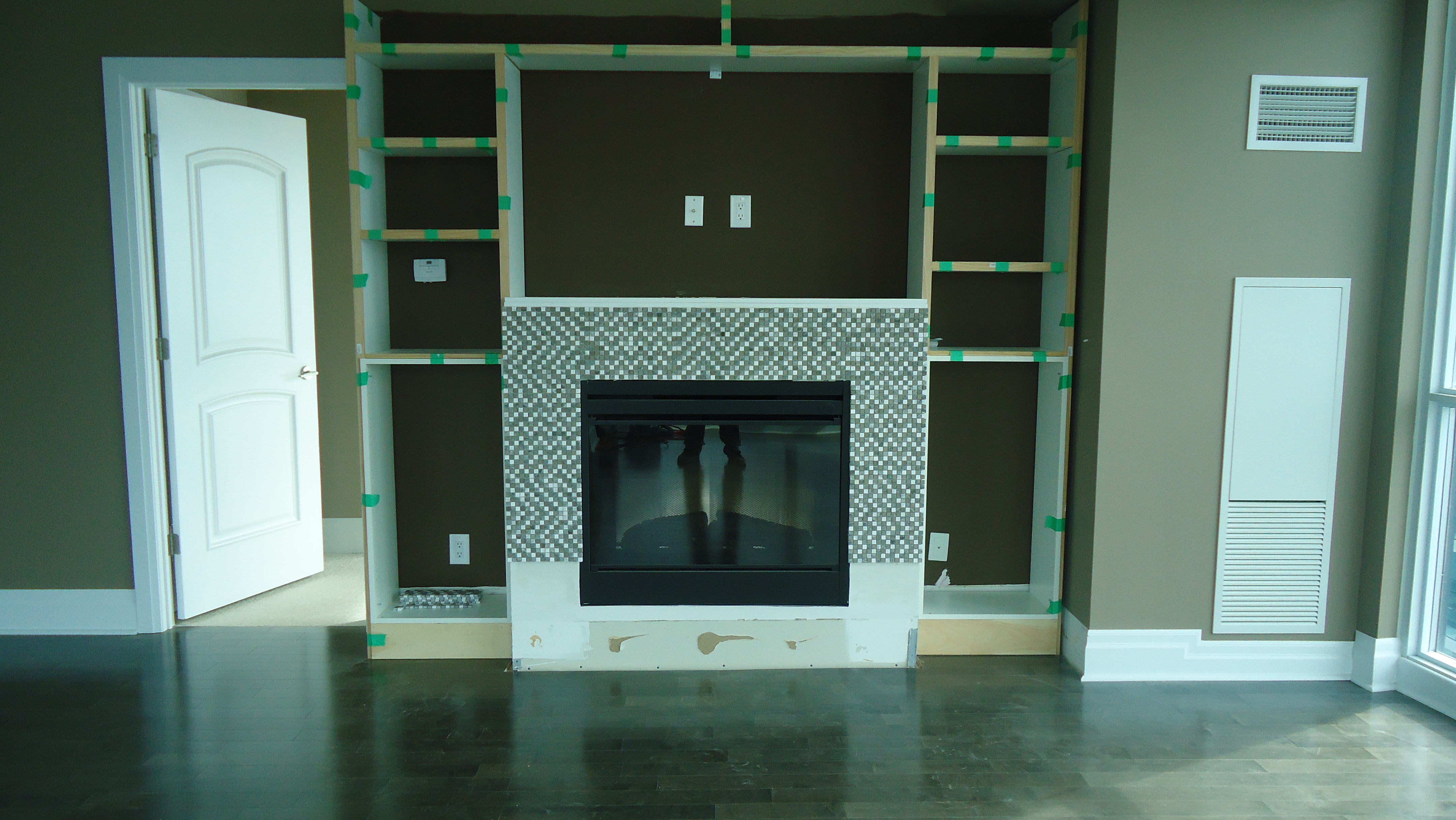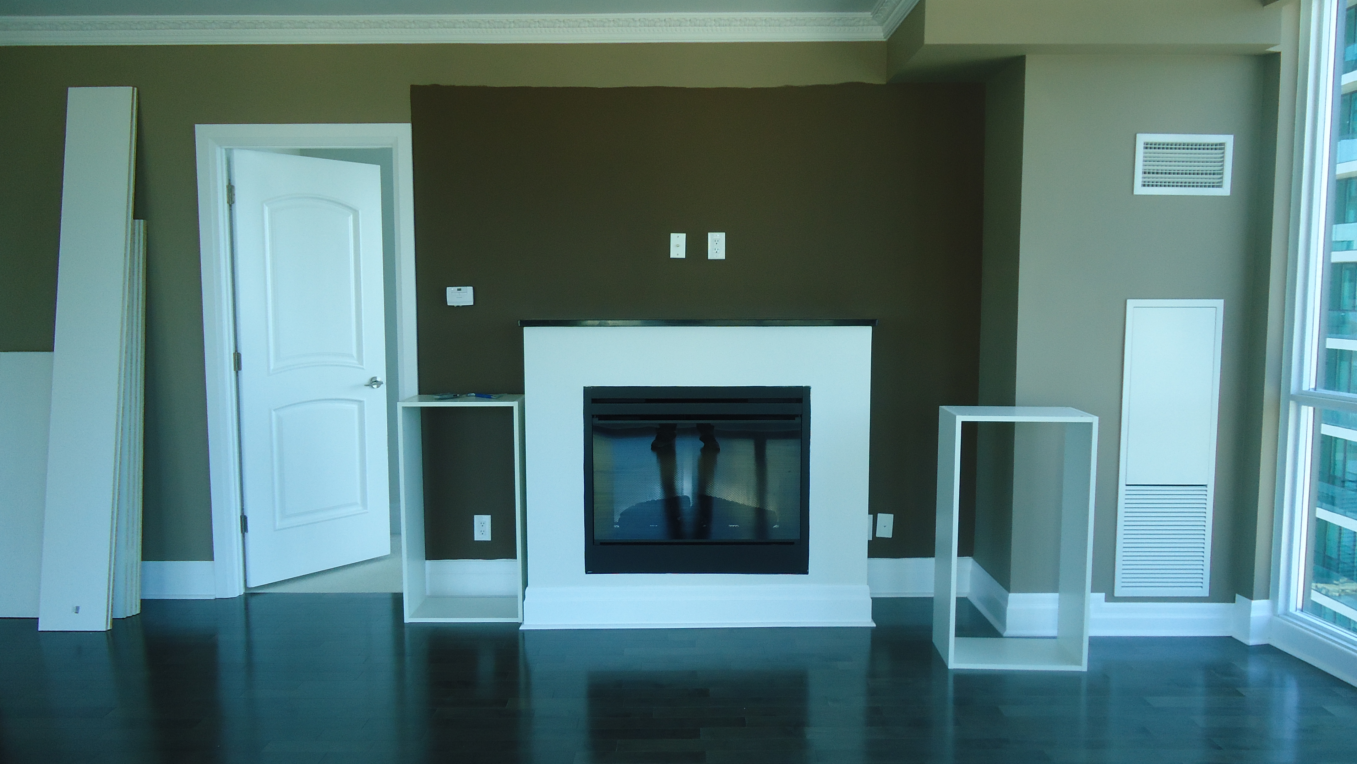 This condo unit came with an electric fireplace, thankfully a Dimplex, which in my opinion is the only brand to buy, but, unfortunately it came with nothing but a drywalled box as a surround.