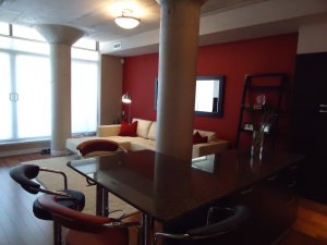 A couple of years ago I worked on a loft in the fashion district and you can see from the photo below that there was really no practical place for a dining table and chairs. The island was too small to seat more than one or maybe two people comfortably and the client really wanted to be able to entertain friends and family.