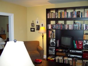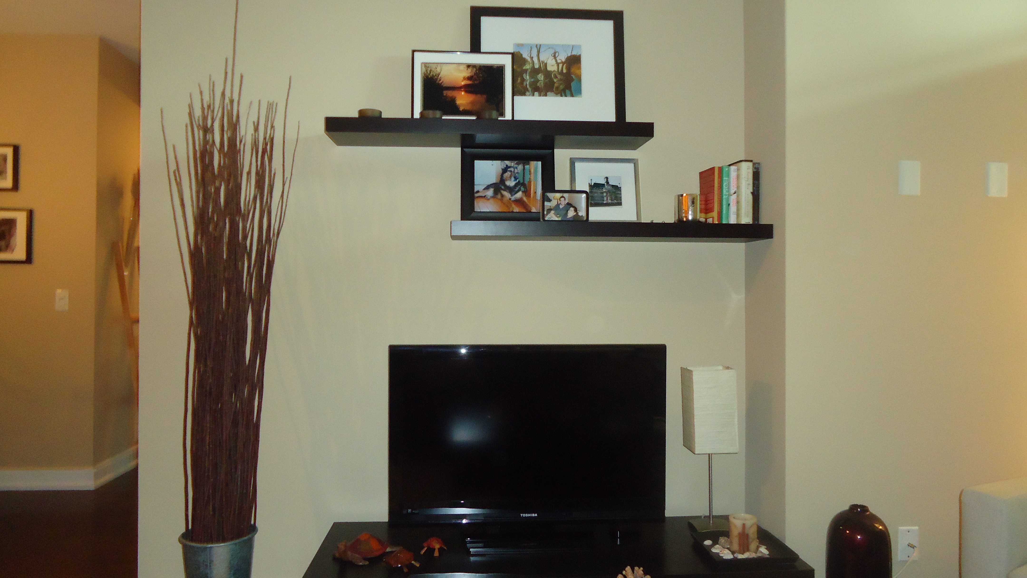 Another idea for you is to combine photos with art, books and decorative pieces on a shelf or shelves.