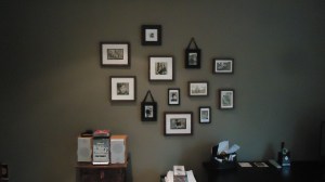 Here’s another gallery of client photos done a little differently. Still black and white, but this time I used different sized and shaped frames. Note also, the frames on the next wall on the photo ledge.