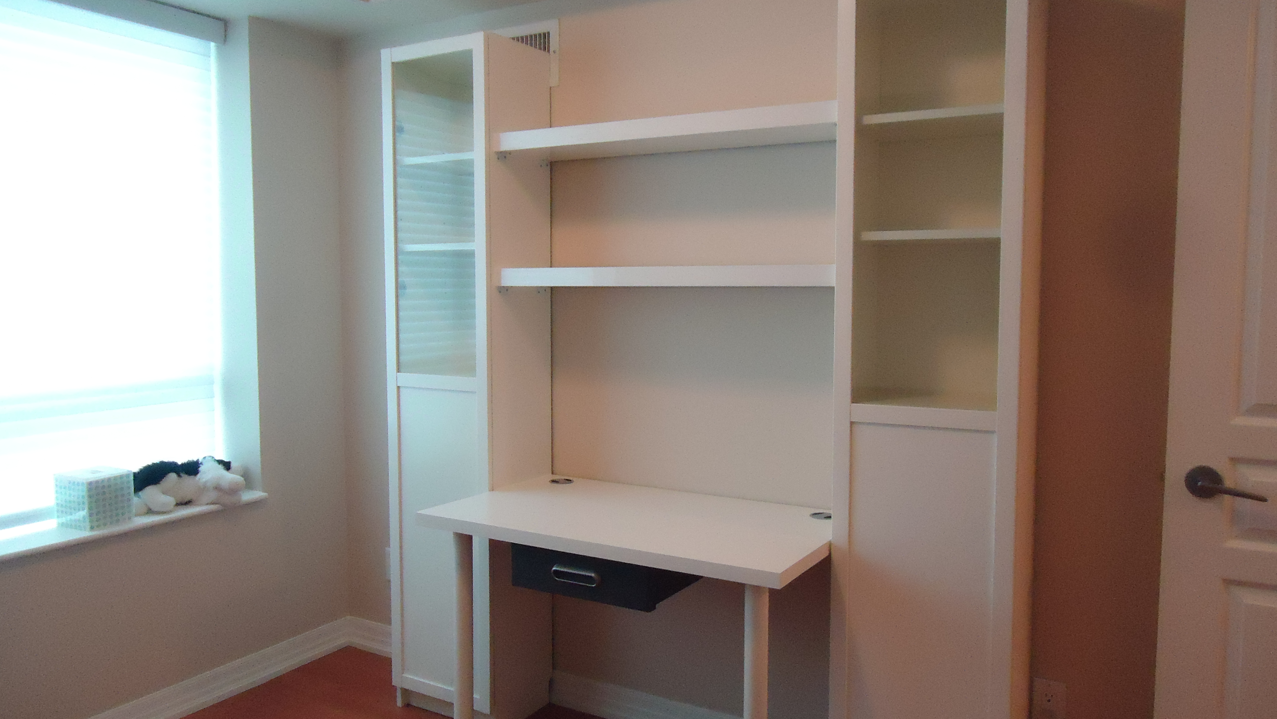 Take 2 Billy bookcases with doors, add a Vika table top with a drawer in between , mount 2 Lack shelves between the bookcases using L-brackets (you’ll have to cut them to fit) and voila, you end up with this: