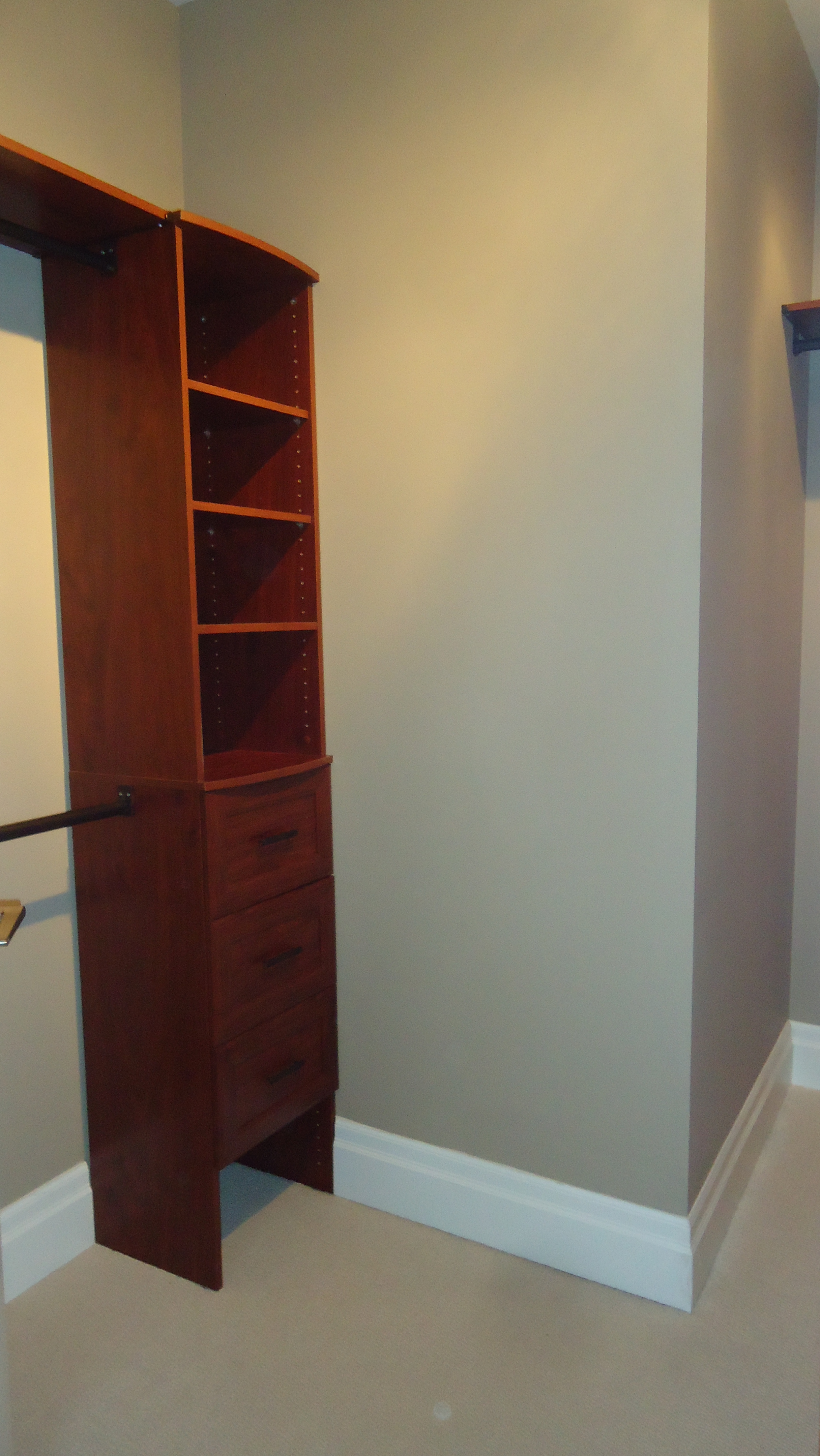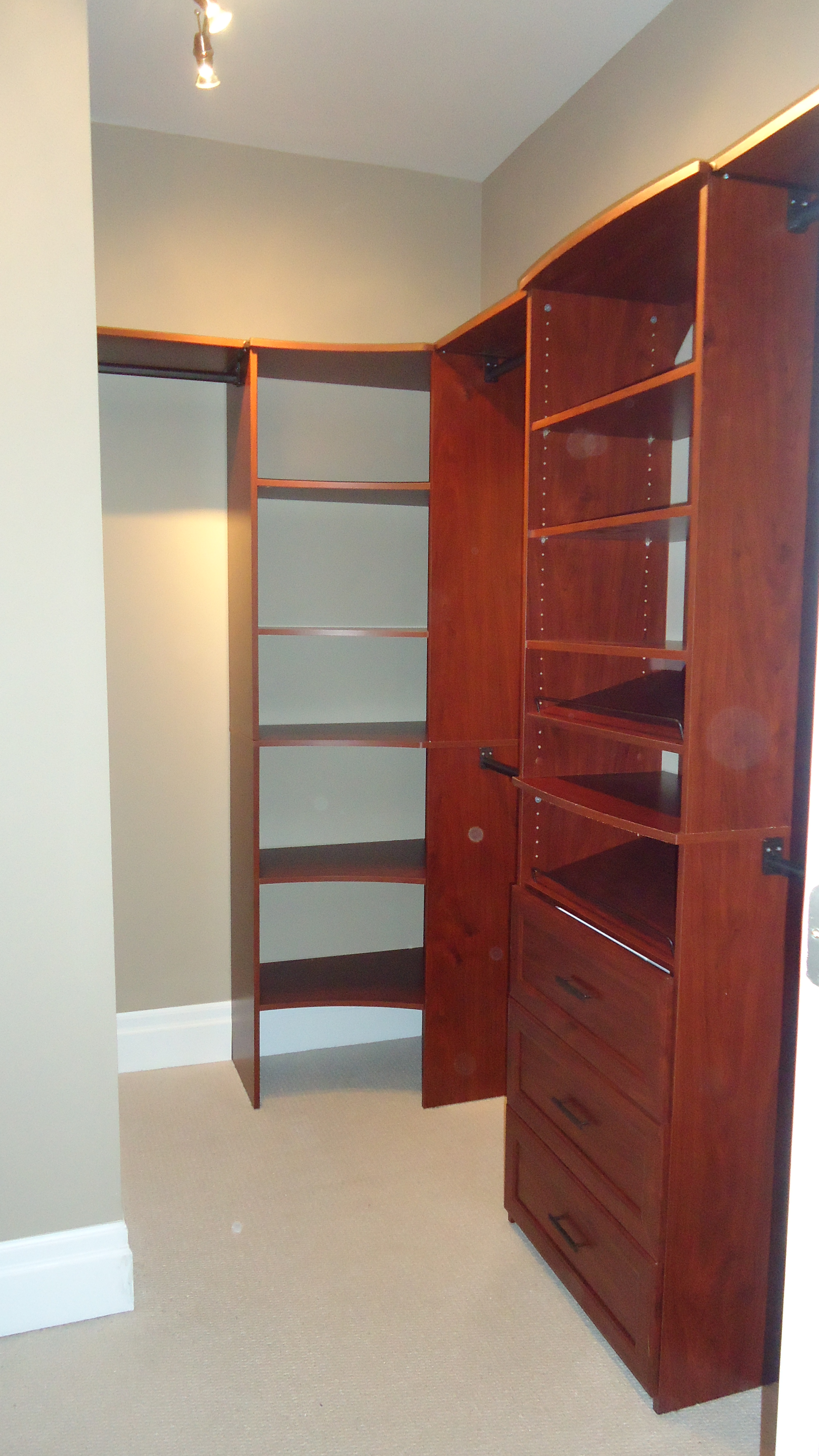 I designed a system that combined a corner tower for sweaters and seasonal clothing items, two wall towers housing drawers, shoes storage and shelves for folded items and seven closet rods to hang everything else. A top shelf links them all together and provides storage for items used once in a while such as luggage.