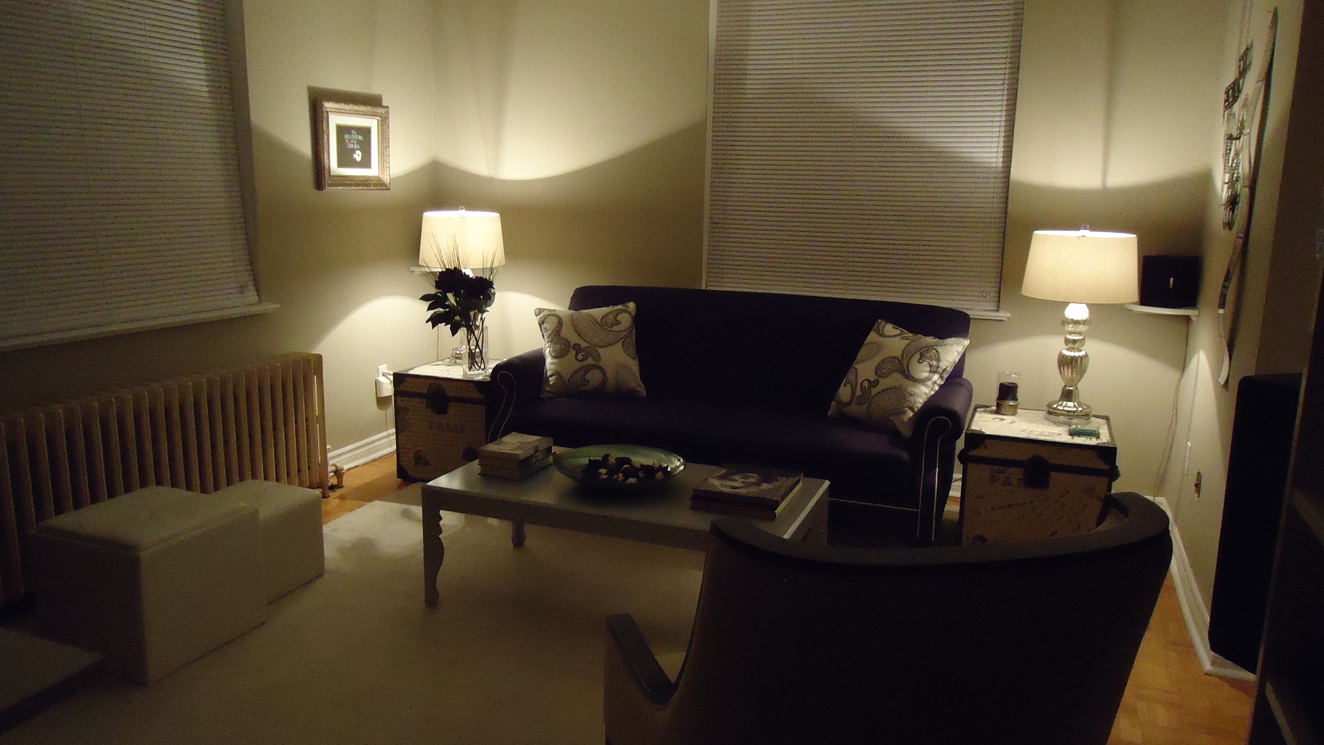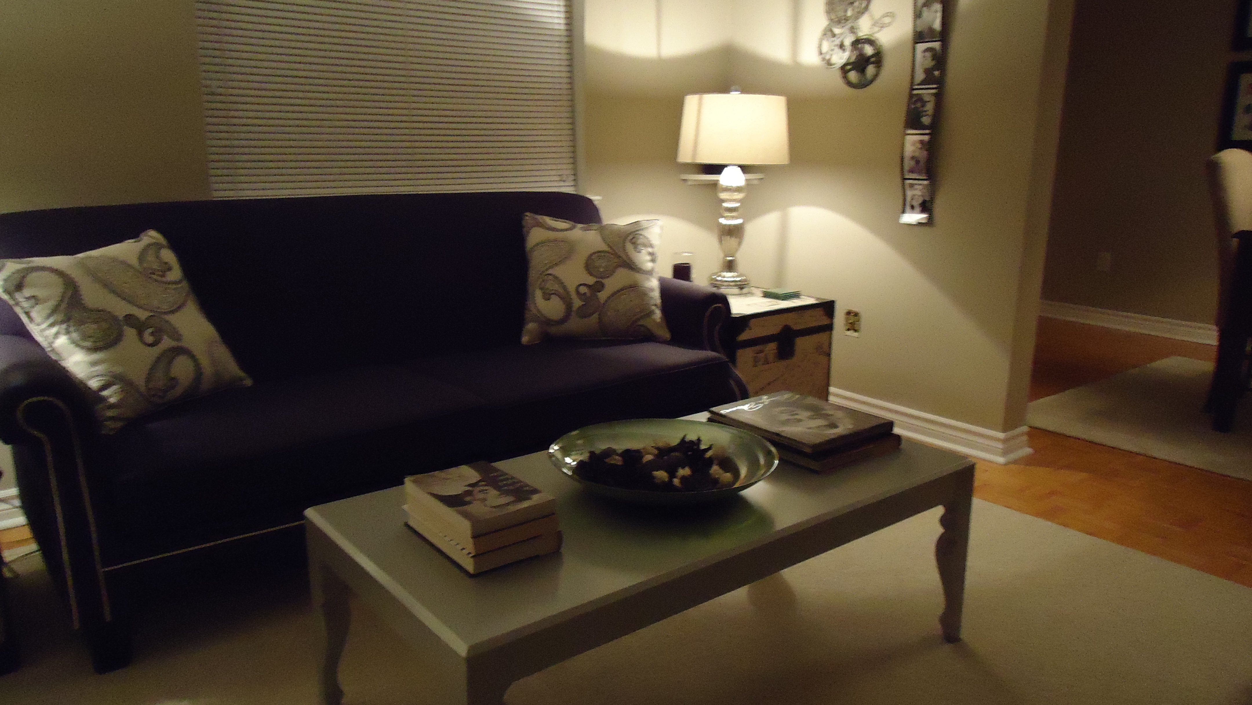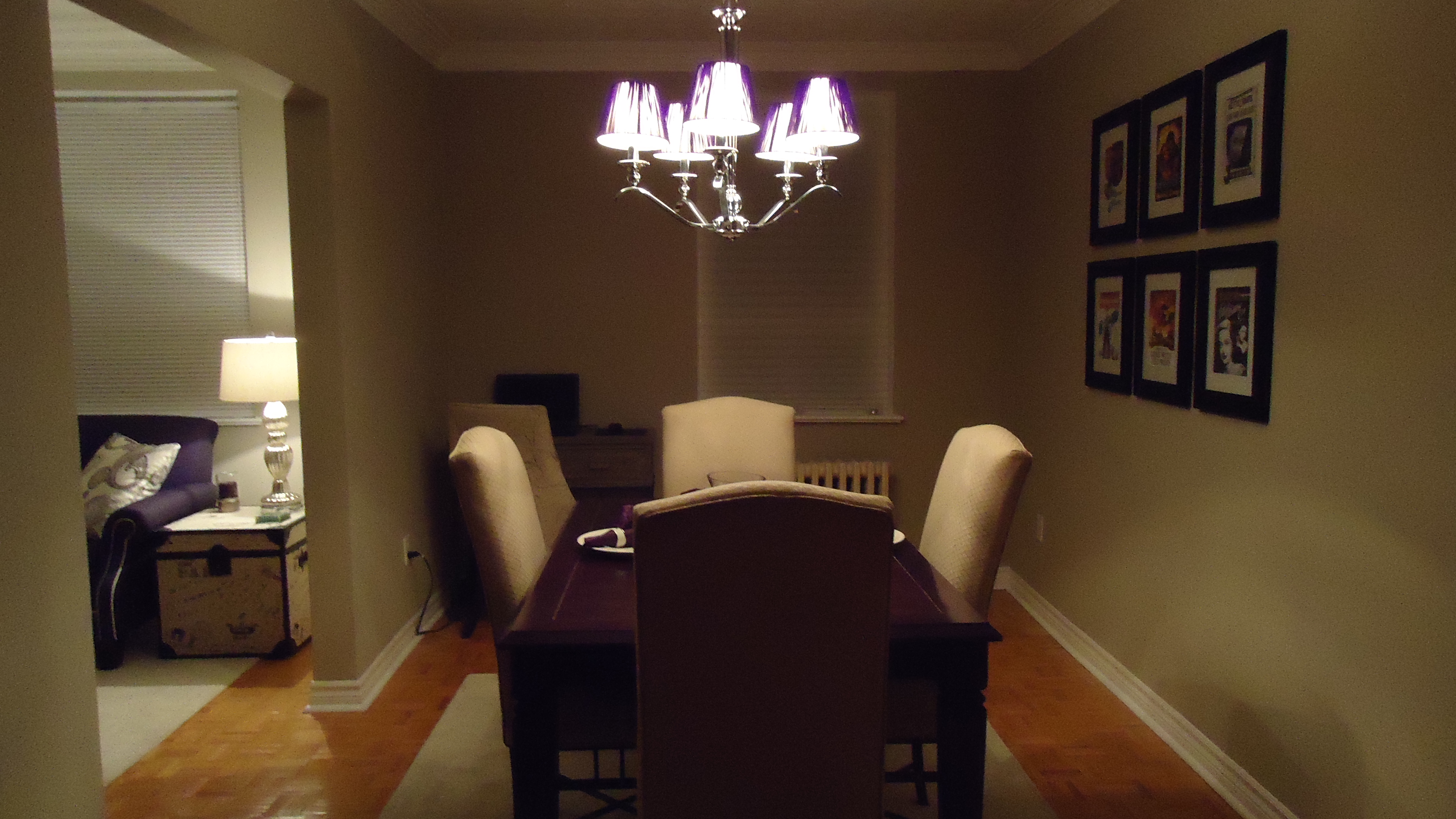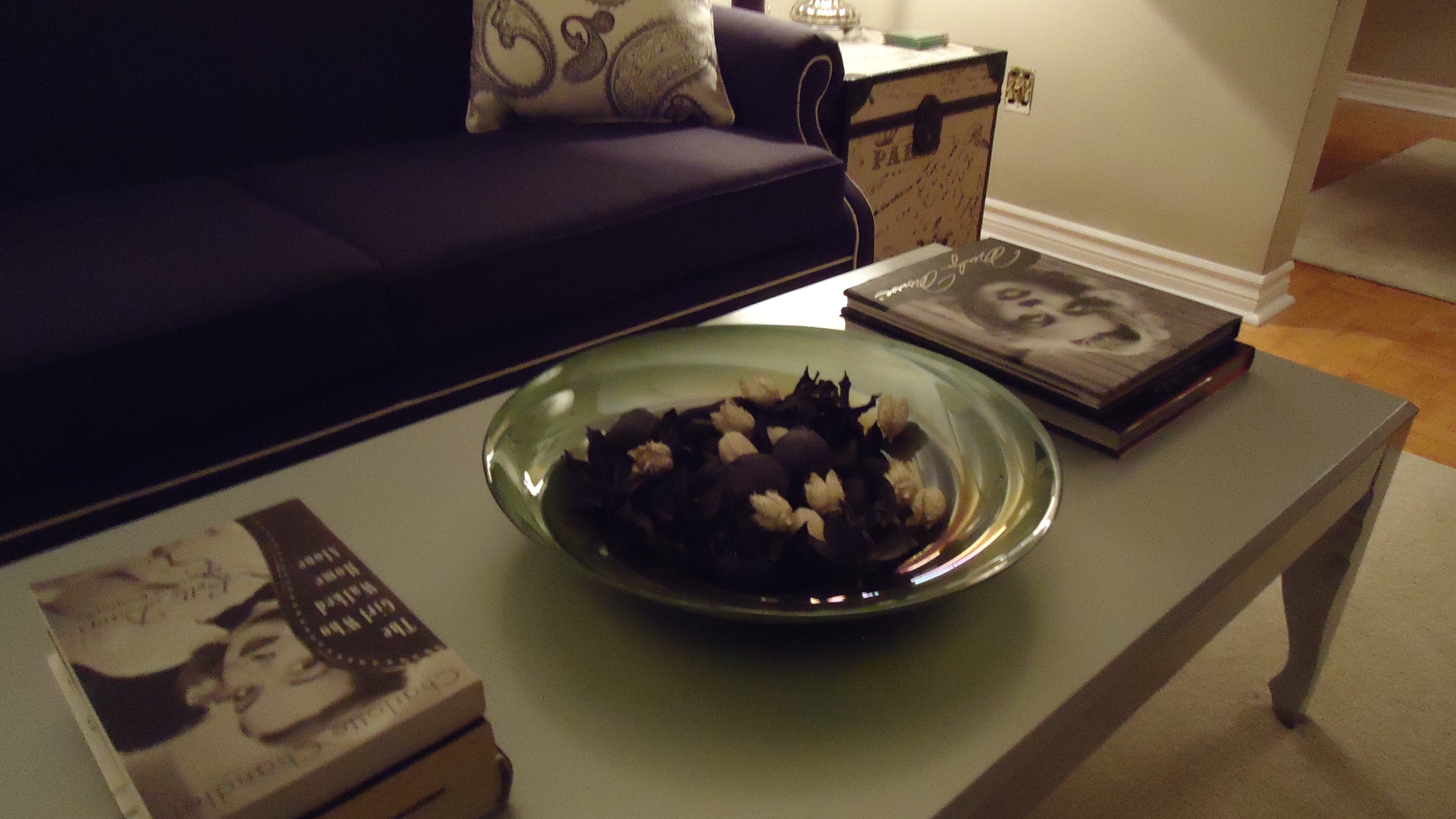 Accessories such as purple flowers and candles, a green bowl and green and purple vases in the fireplace were used to provide the colour.