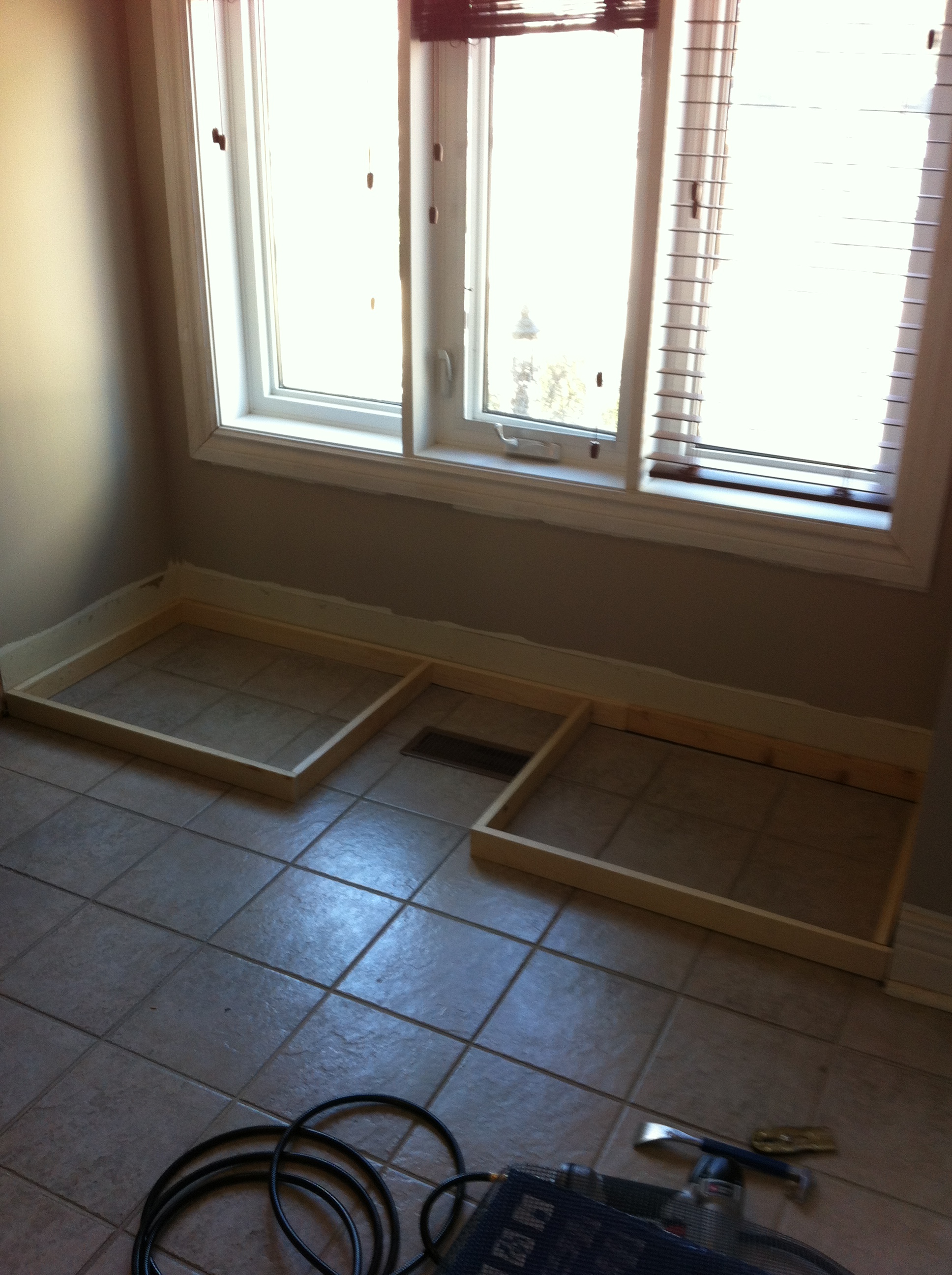 I began by removing the baseboards and building a base from pine, leaving an opening for the heat register.