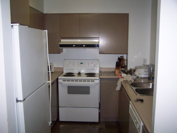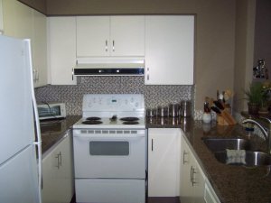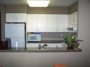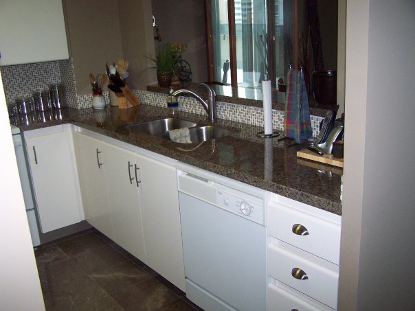 New flooring, new window blinds, paint, a complete kitchen makeover including granite counter tops, a glass and marble mosaic tile backsplash, a new faucet and undermount sink, all combined to bring this terribly outdated condo into the new millenium.