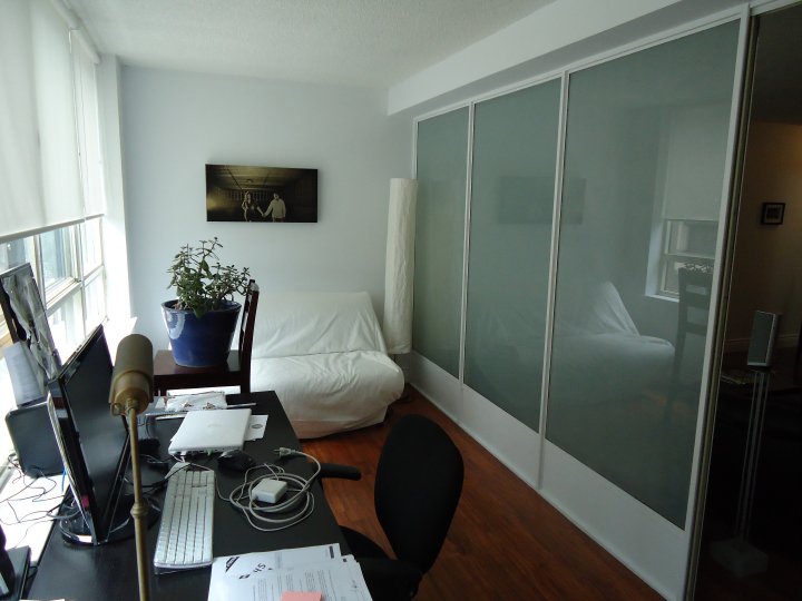 None of the rooms were being used effectively. There was a cluttered desk in the bedroom, a cluttered dining table in the sunroom being used as a desk, 2 sofas in the living area and a massive old big screen TV in the dining area. It was impossible to work, entertain, eat or do much of anything in the space.
