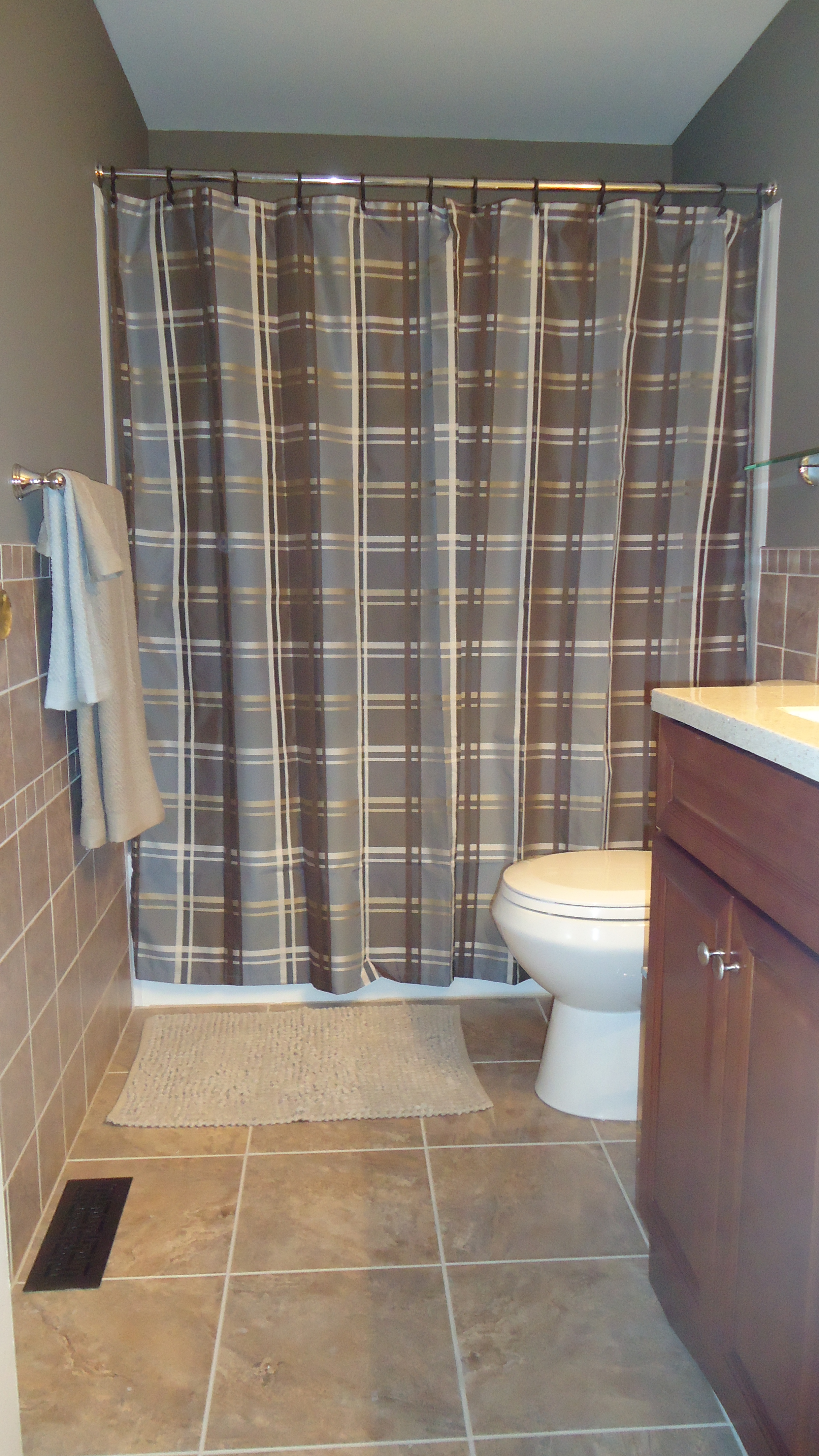 We tiled the whole bathroom, installed a new vanity, faucet, light fixture and toilet, and had the tub refinished. To keep costs down, we installed an acrylic shower liner over the existing tiled tub surround rather than re-tile.