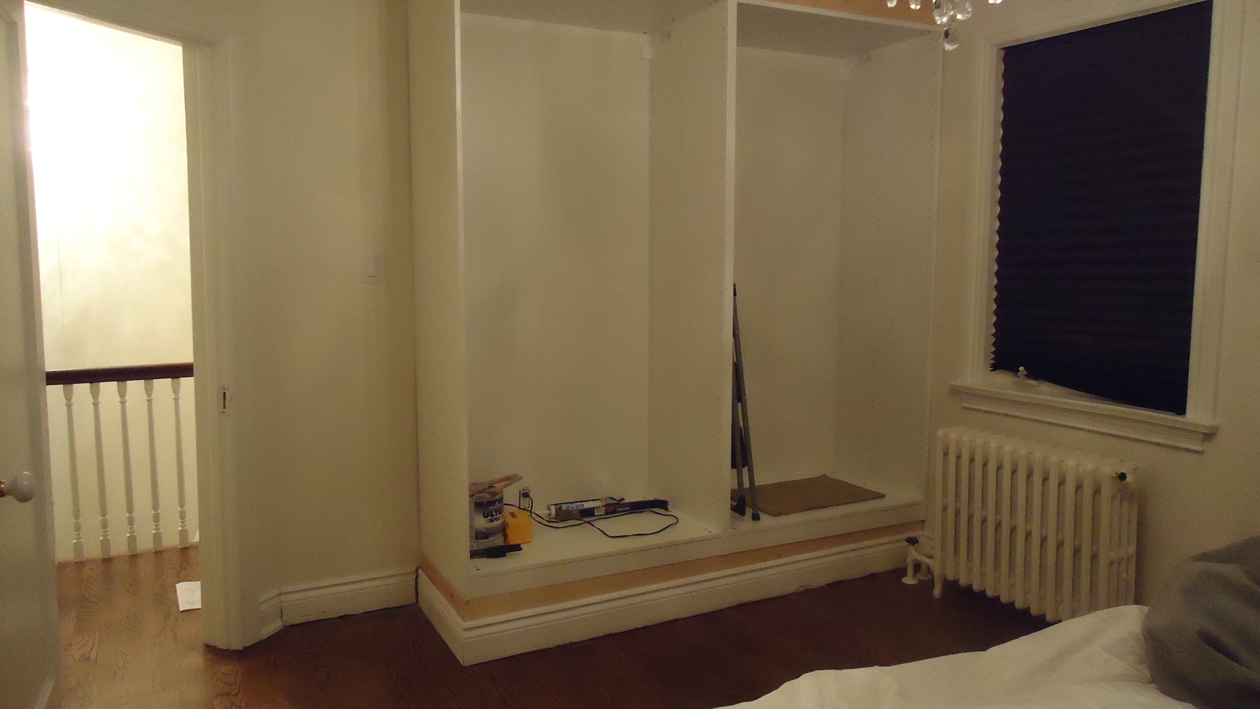 The plan was to take advantage of a large empty space in the master bedroom and by using the Pax system from Ikea, build him a custom closet that would look like it was part of the house and not just a couple of wardrobes set in place.