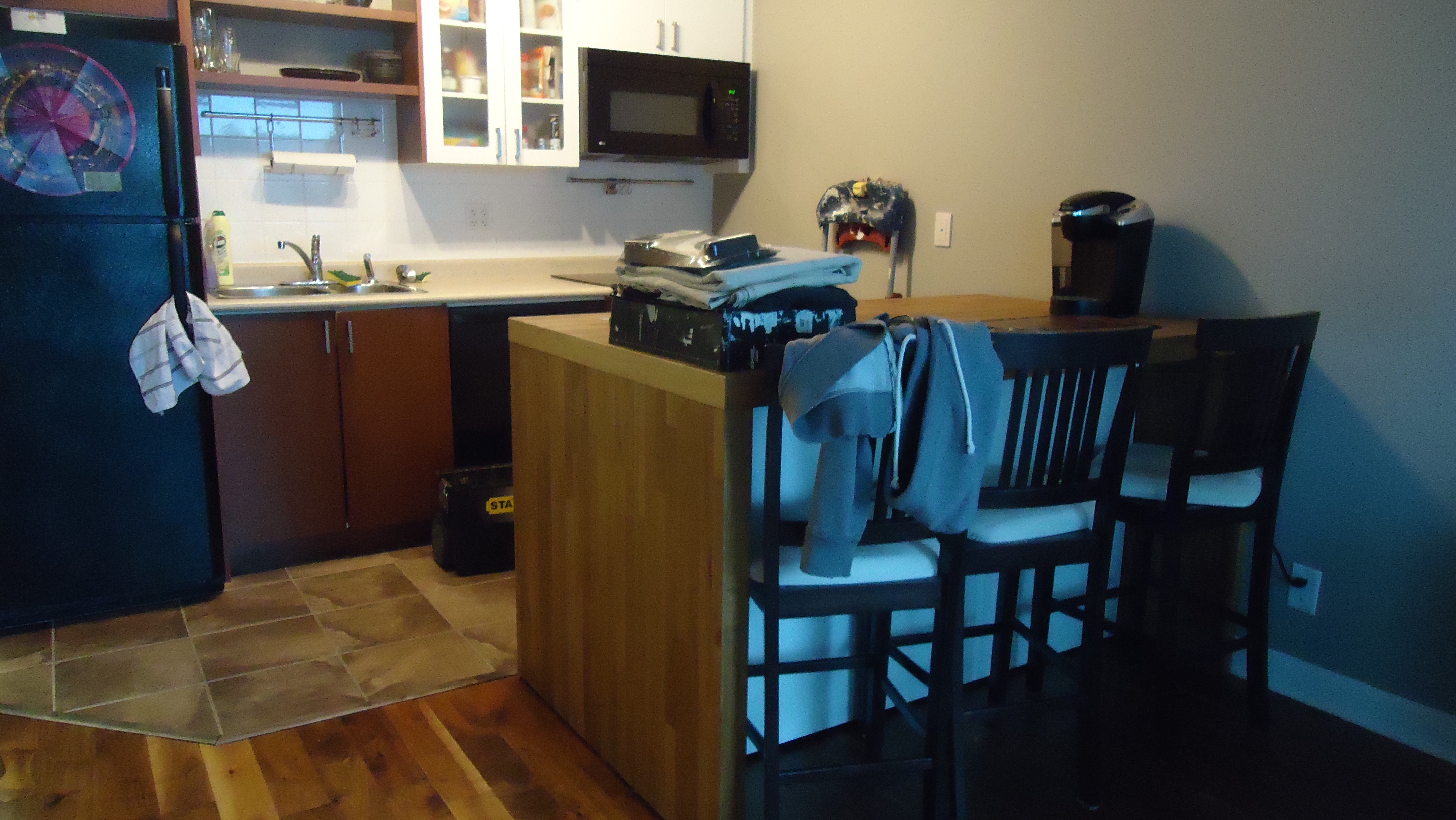 I had a particular concern with the kitchen. There was just way too much going on and it was hard to know where to look. There was a beautiful rustic looking wood floor, cabinetry in an odd combination of white and red mahogany and a massive butcher block island that completely dominated the space. On top of that was the old ugly counter top and faucet and a backsplash in 6 X 6 white ceramic tiles which looked as though they were leftover from the bathroom.