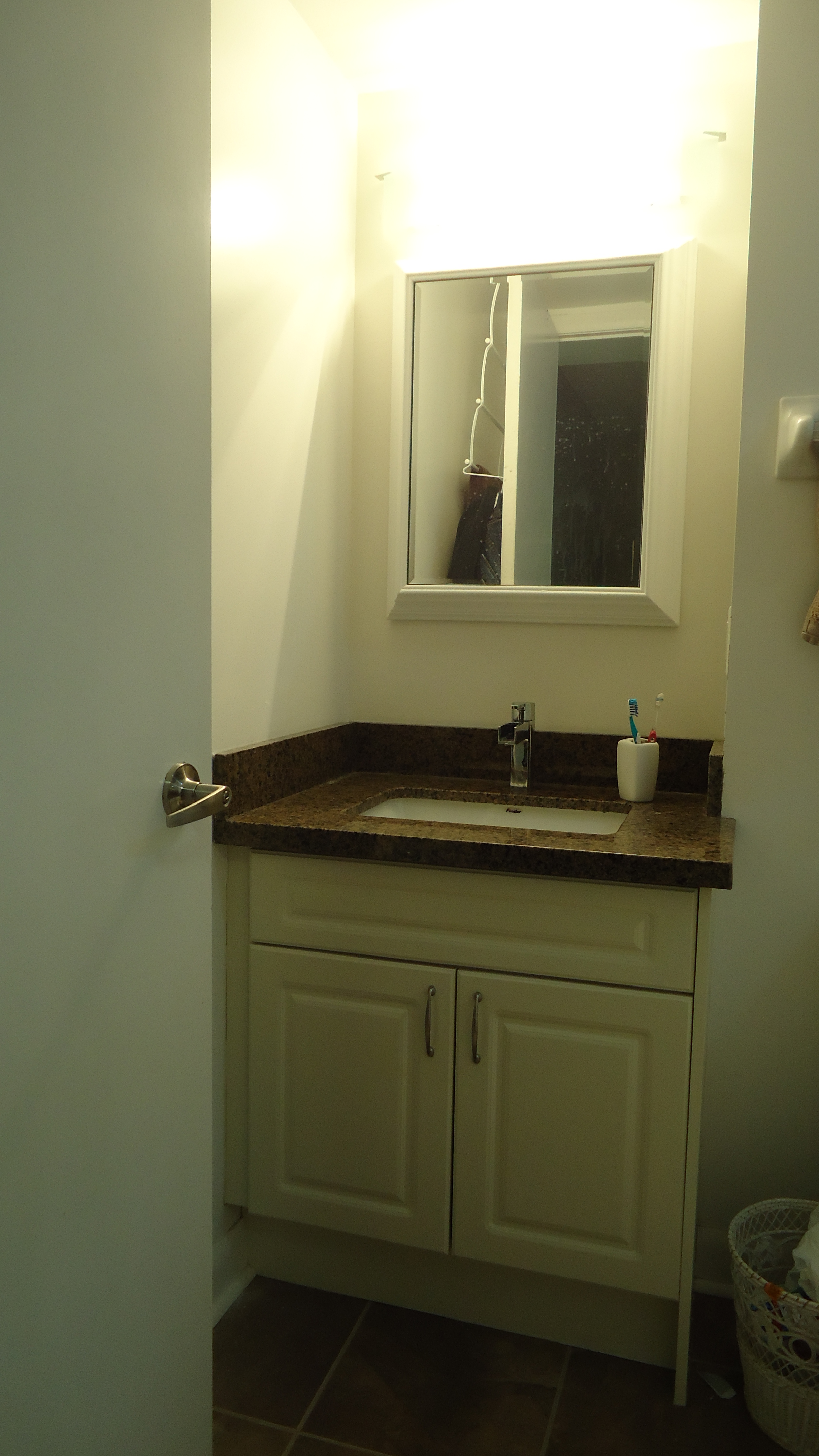The bathroom was much less involved. We simply painted the vanity in the same antique ivory and replaced the counter top with the same granite we chose for the kitchen. An under mount sink, a new faucet and a medicine cabinet completed the makeover.