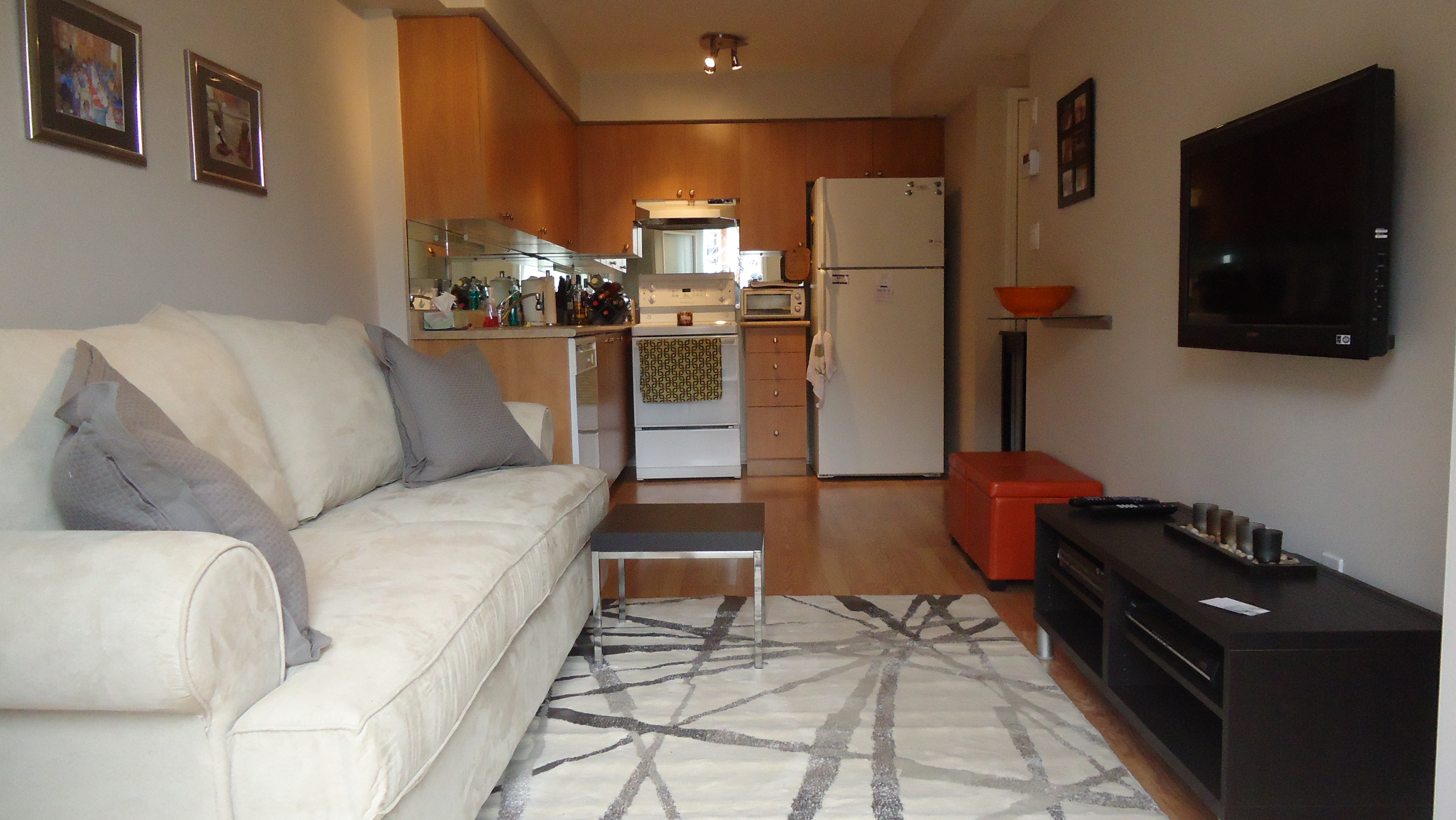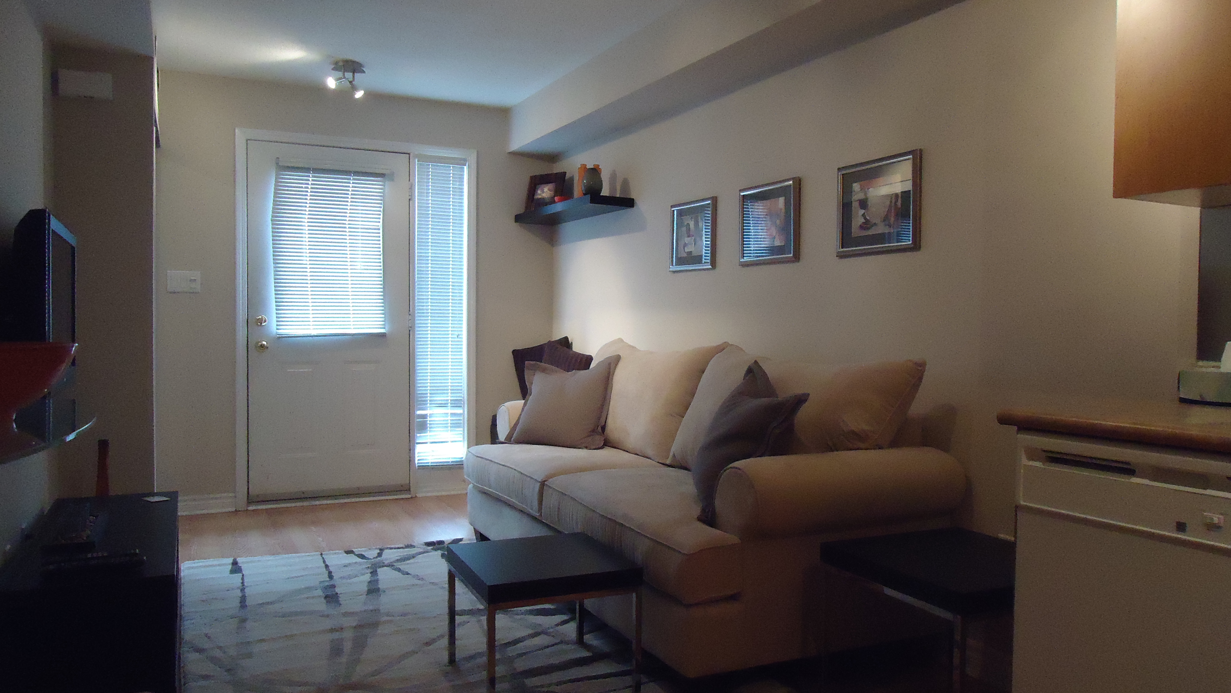 To minimize contrast, which is critical in a small space, our walls, sofa and new area rug were all the same base colour. Contrast, as I’ve mentioned before, is one of the single greatest factors contributing to a space feeling small, so it’s important that all the large pieces be the same colour.