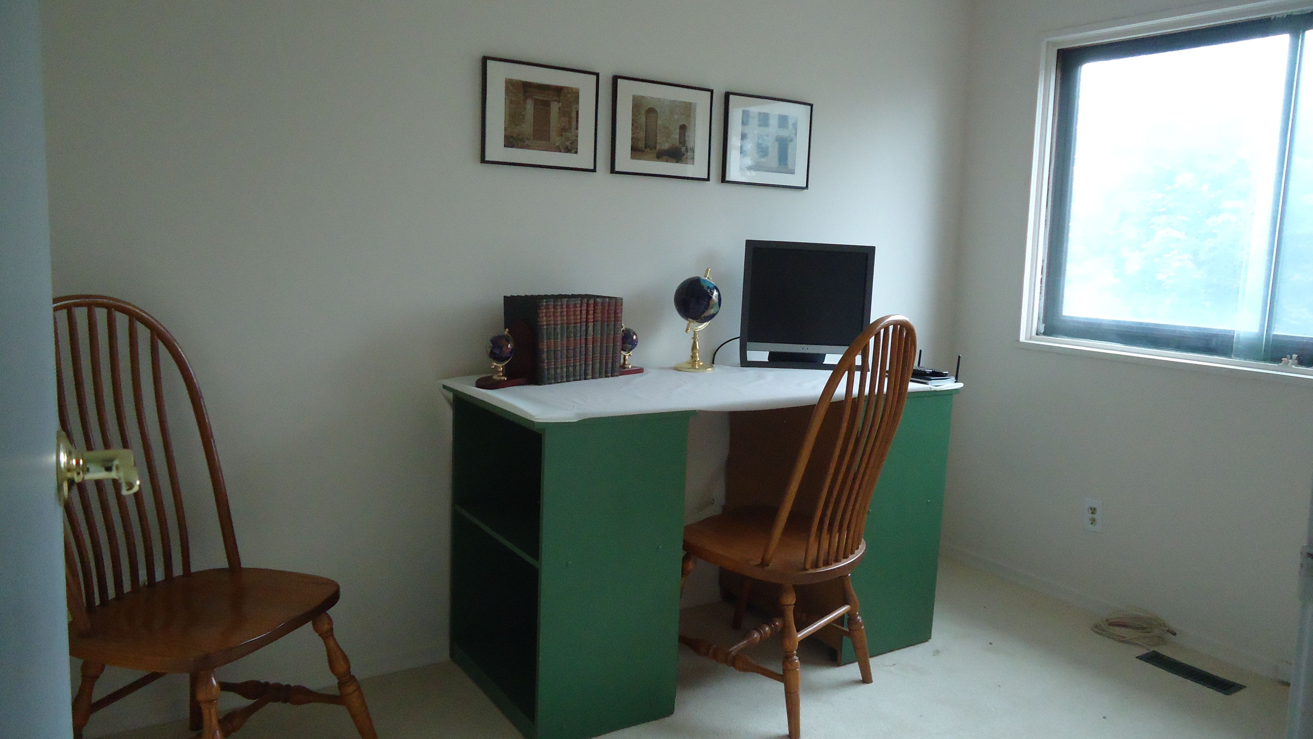 We turned the third bedroom into a home office by building a desk from a couple of bookcases and some plywood and adding a couple of extra dining chairs. It may not be the prettiest thing you’ve ever seen, but at least it filled the room and will give people something to look at besides an empty room.