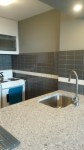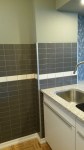 Next came the kitchen backsplash in a traditional subway tile but laid in a stacked pattern for a more contemporary look. I went with a dark gray tile with a band of cream that tied in perfectly with the wallpaper. The tricky part was where to stop the tile and since the owner wanted a backsplash over on the island by the sink, I ended up tiling most of the wall.