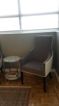 For furniture, I found pieces in grays and creams to tie in with the wallpaper and kitchen tile; a nice modern sleeper sofa for occasional overnight guests, a couple of interesting accent tables, a modern coffee table and two accent chairs, one with arms for reading in and another armless one that could be turned and used as a desk chair for the ladder wall unit/desk (mulit-use furniture is critical in a small space).