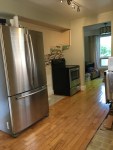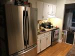 And here is the new, modern kitchen – new cabinetry, new farmhouse sink and faucet, a new stainless range hood, a new white subway tile backsplash and a fresh coat of paint:
