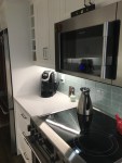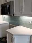 In the condo, the clients chose a modern glass subway tile in a traditional brick pattern.