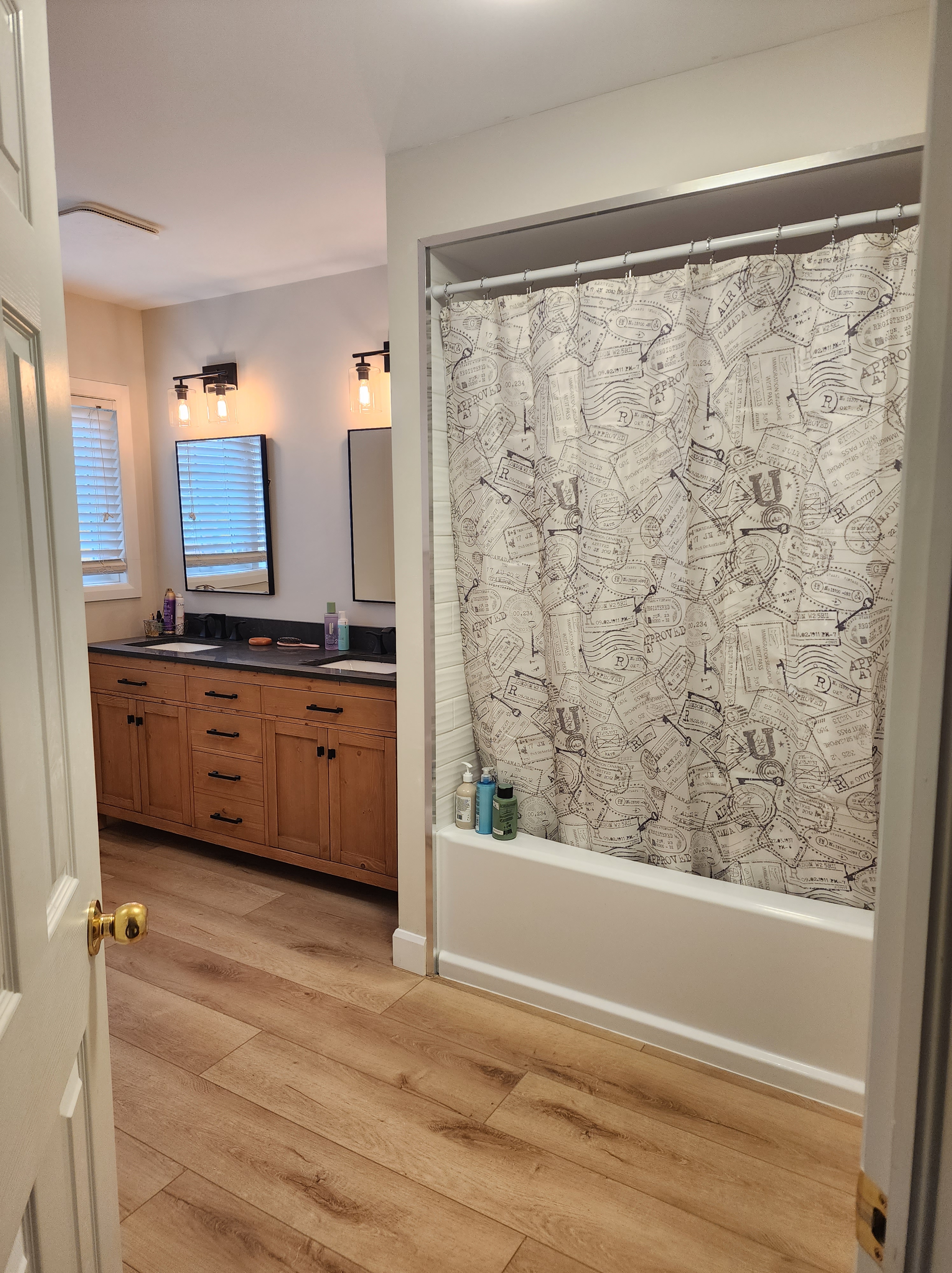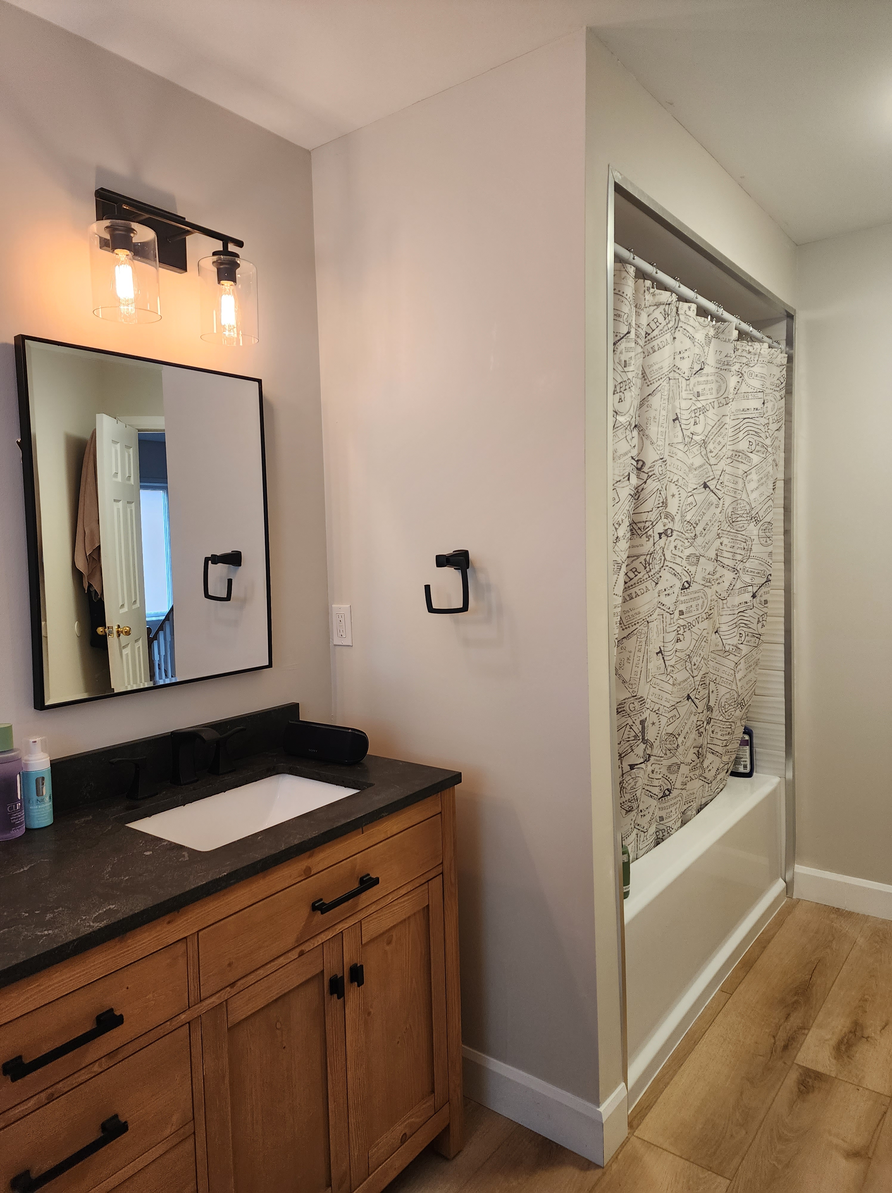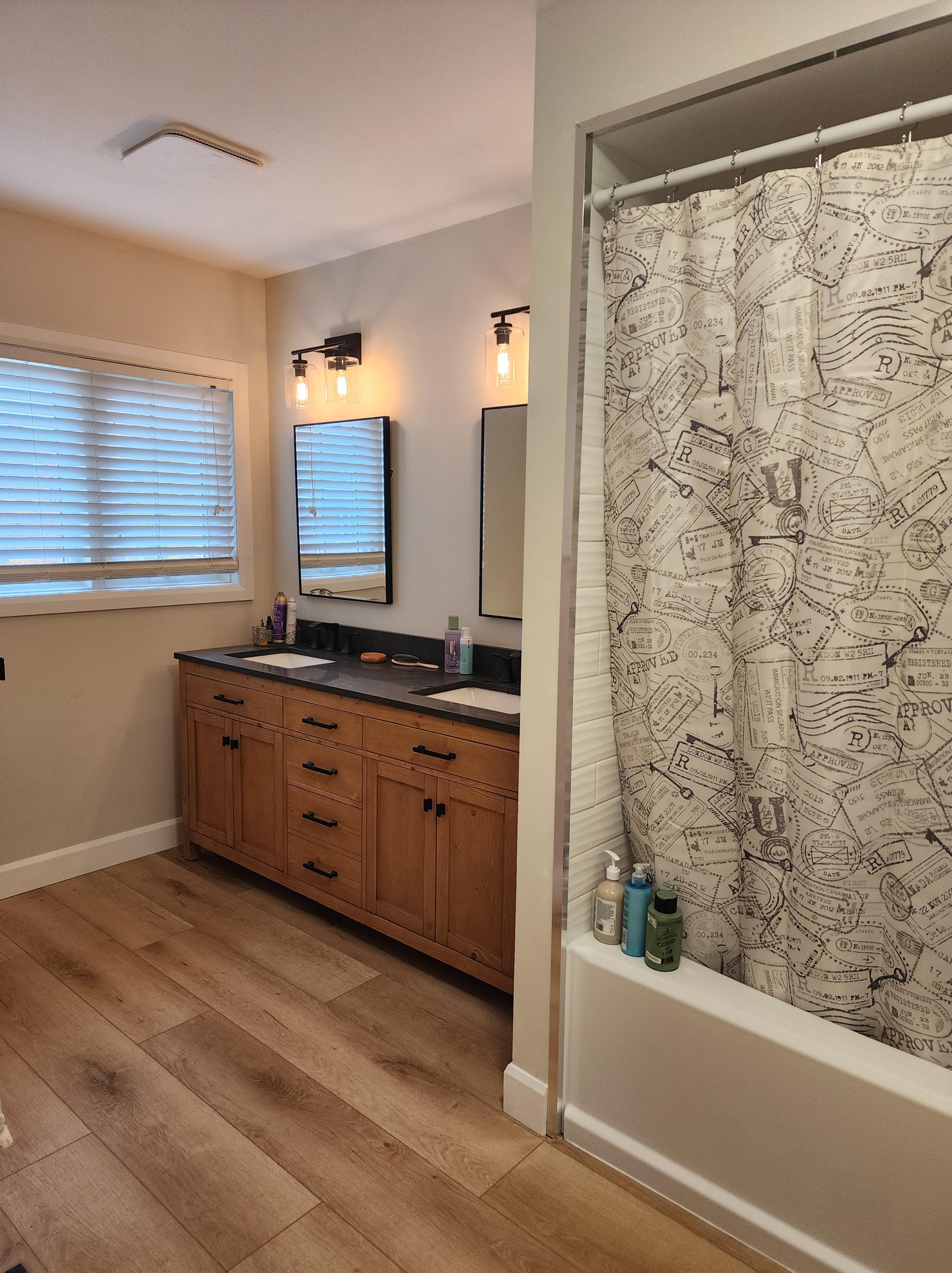 In addition to the fireplace makeover and the removal of a load bearing wall, we’ve also completely redone the main bathroom.