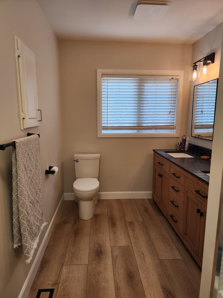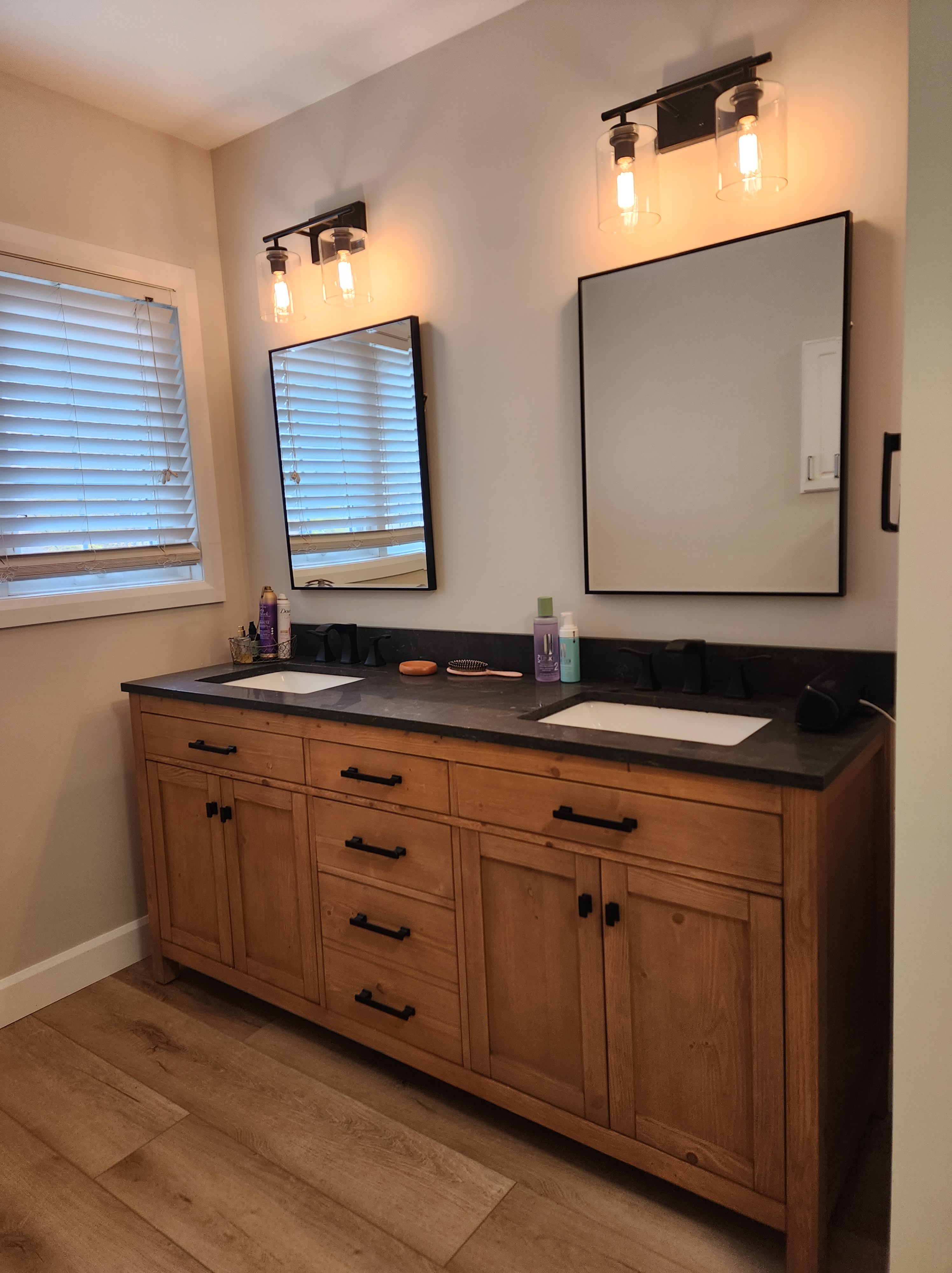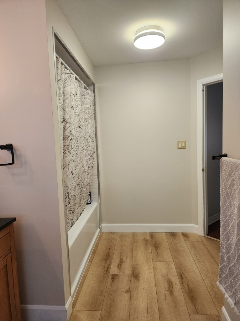 In addition to the fireplace makeover and the removal of a load bearing wall, we’ve also completely redone the main bathroom.