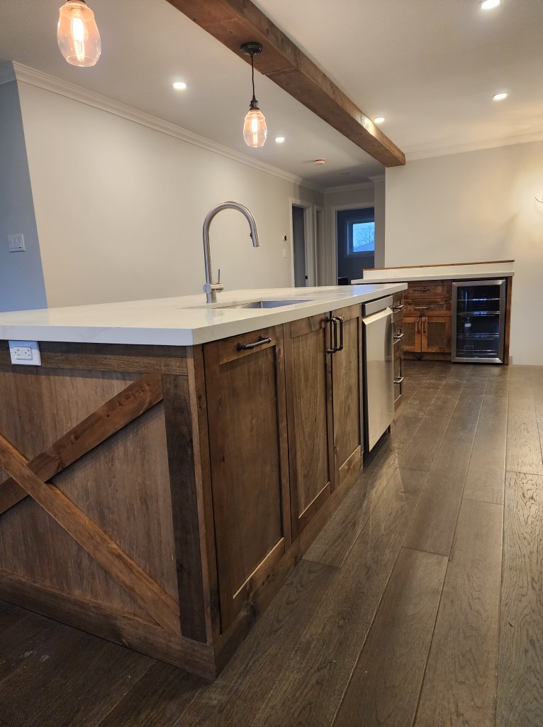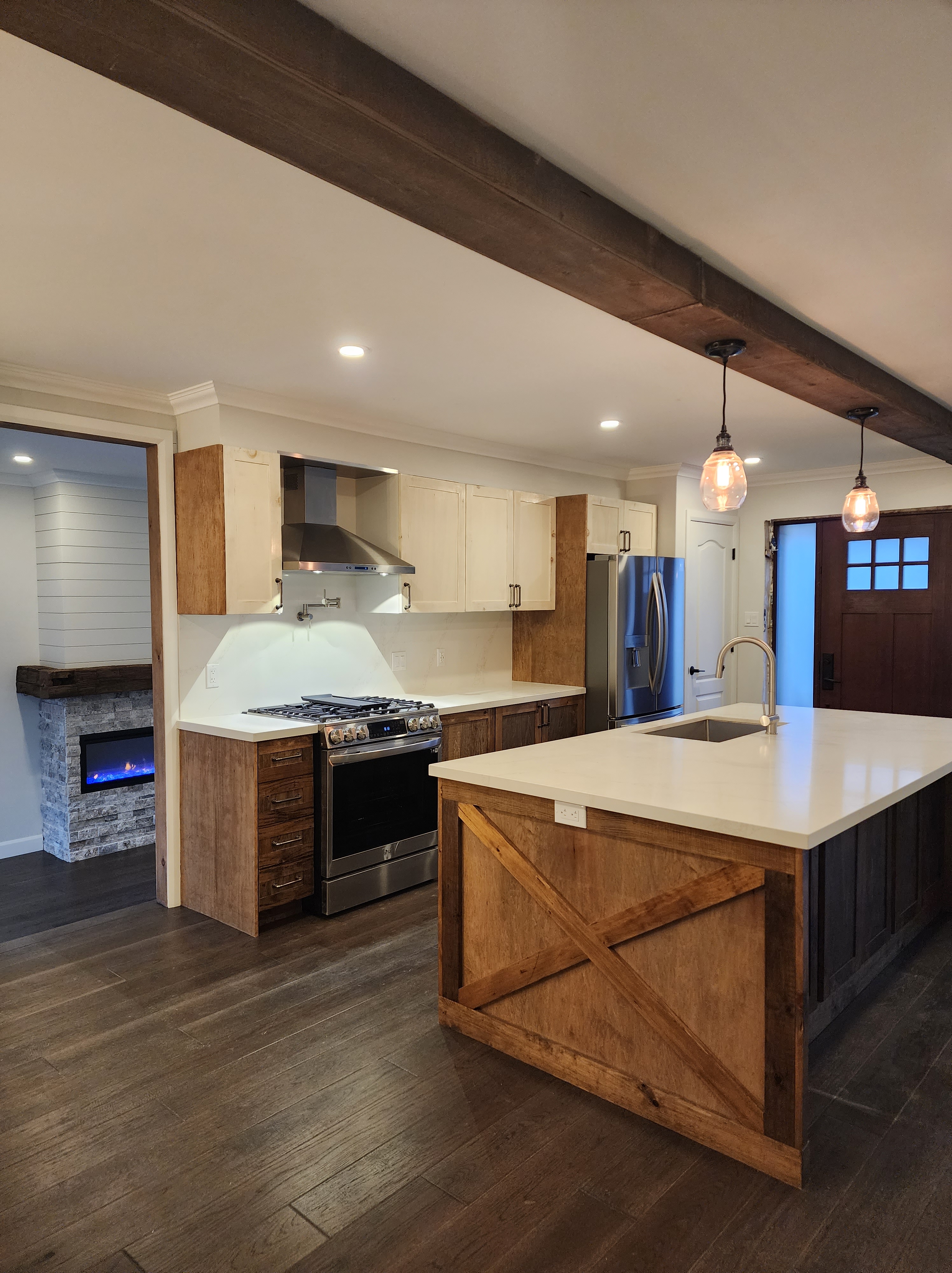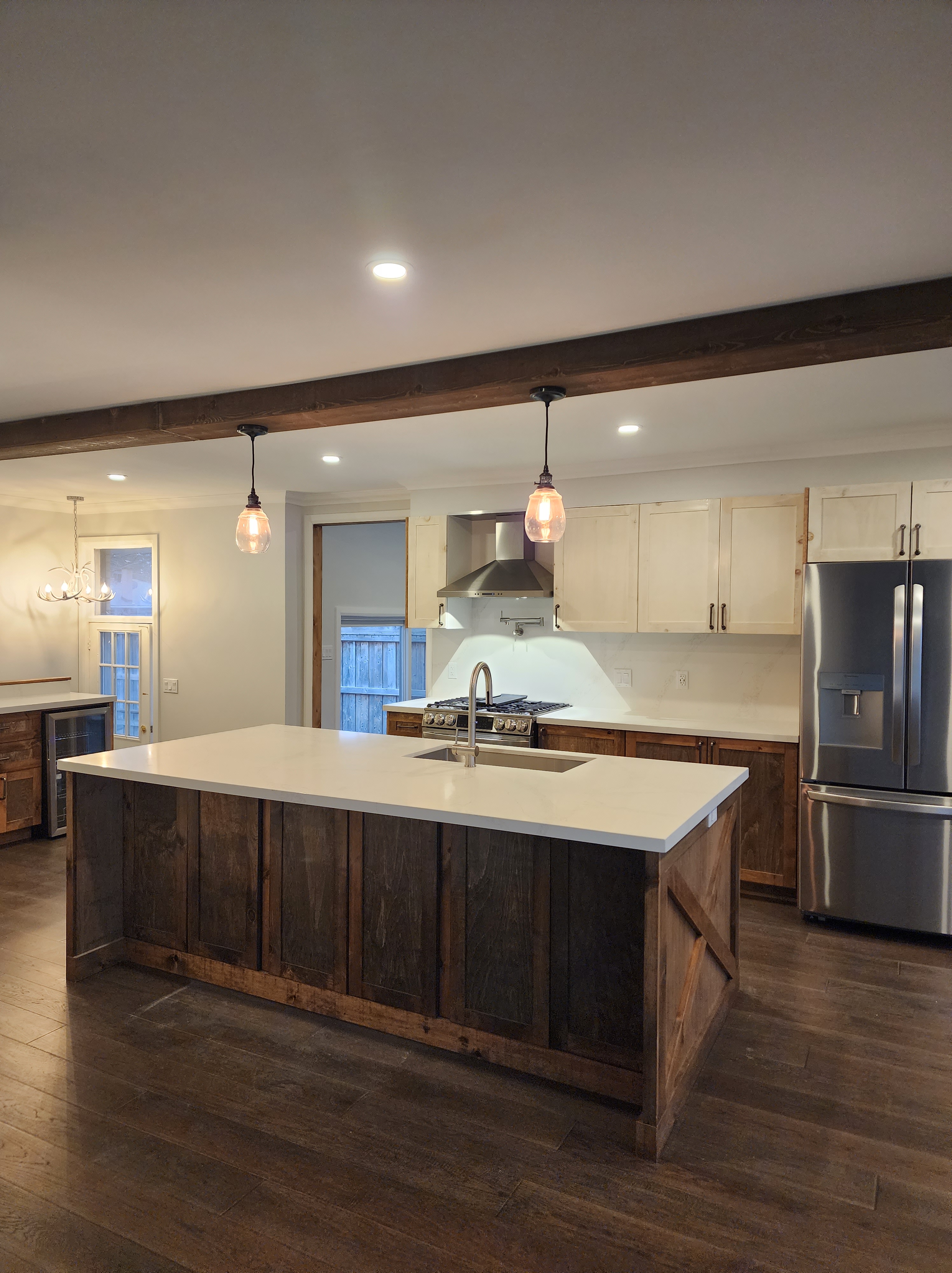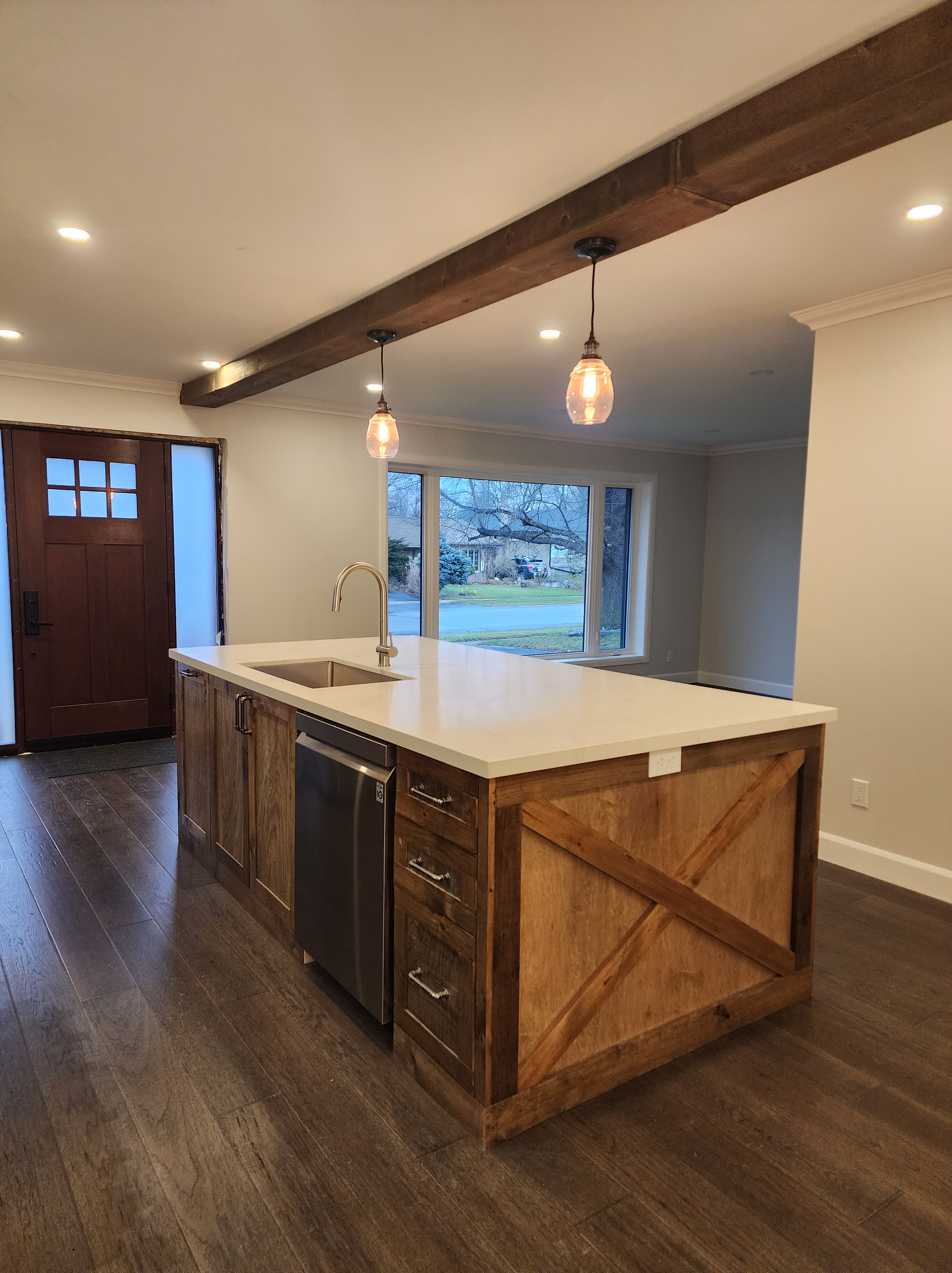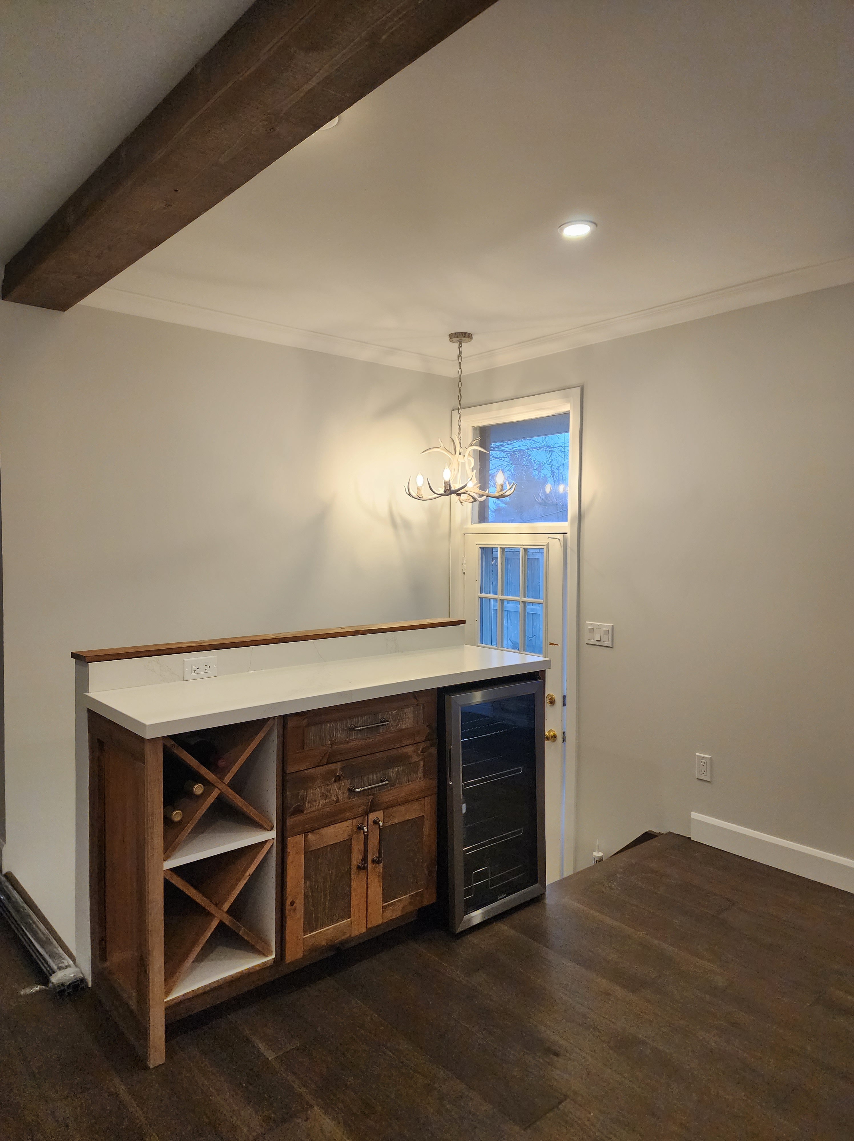 We built a coffee/wine bar with a built in fridge and two add a rustic tone to the space, we built a 25 foot long beam spanning the length of the main area and installed two pendant lights.