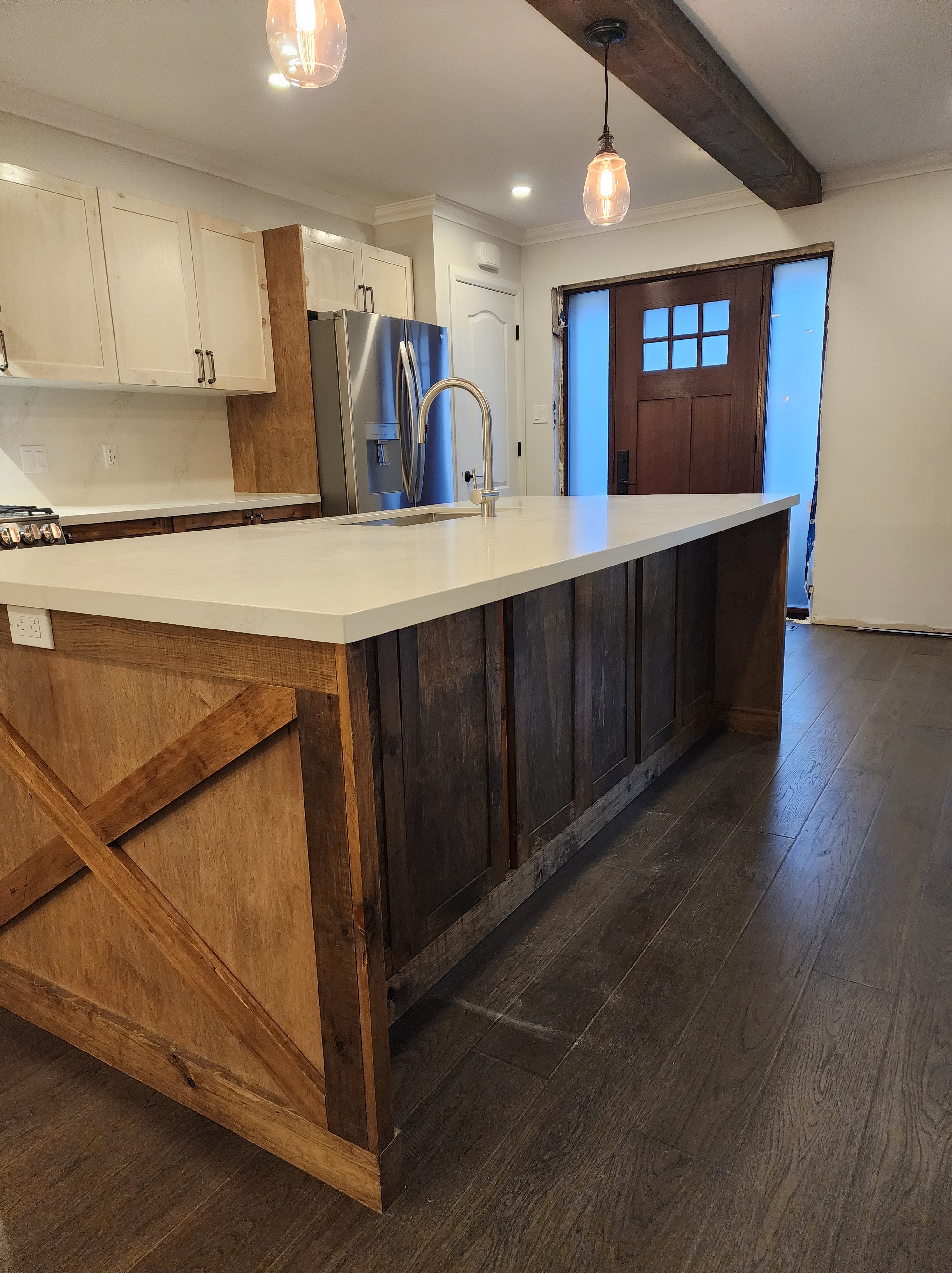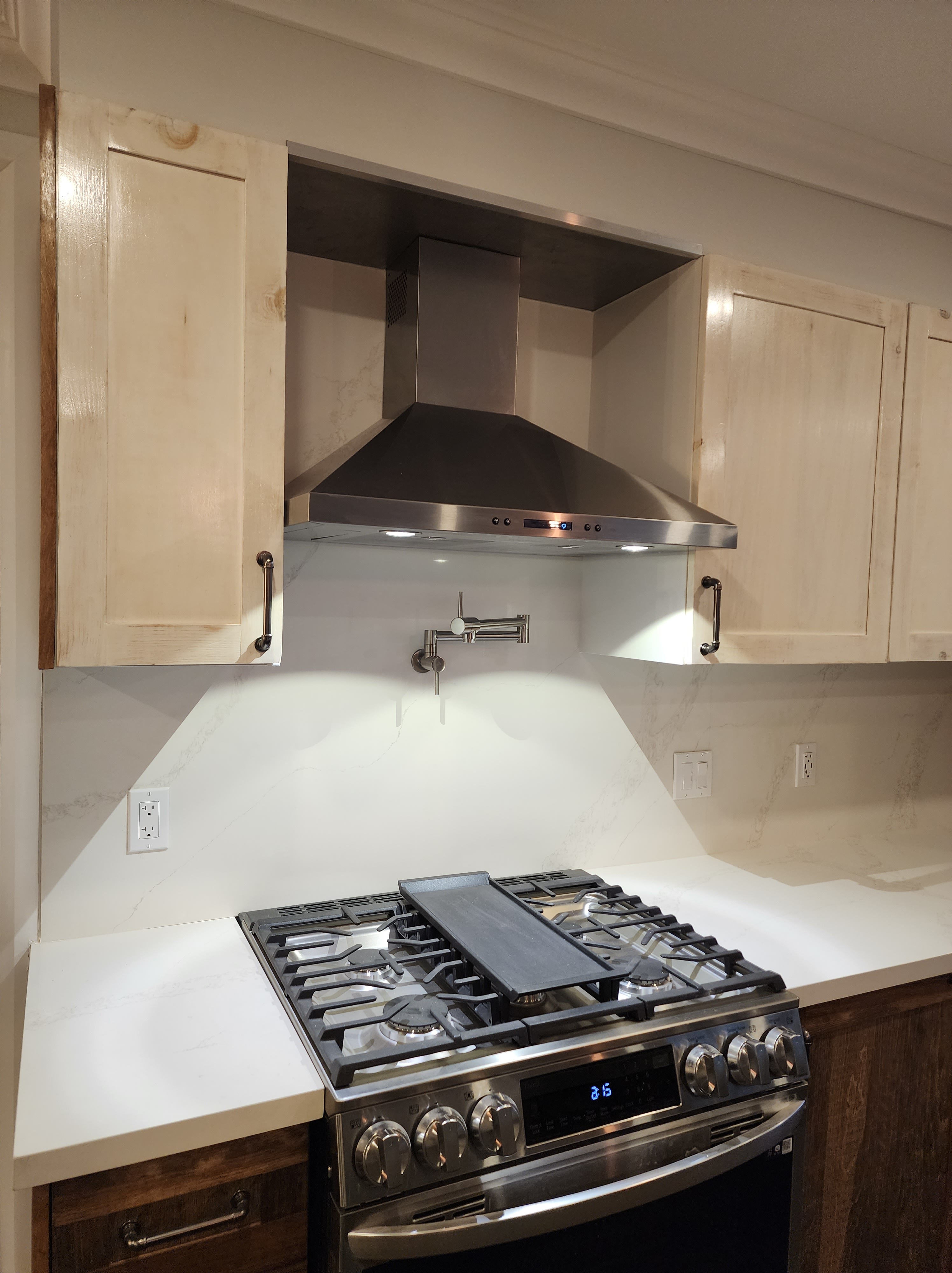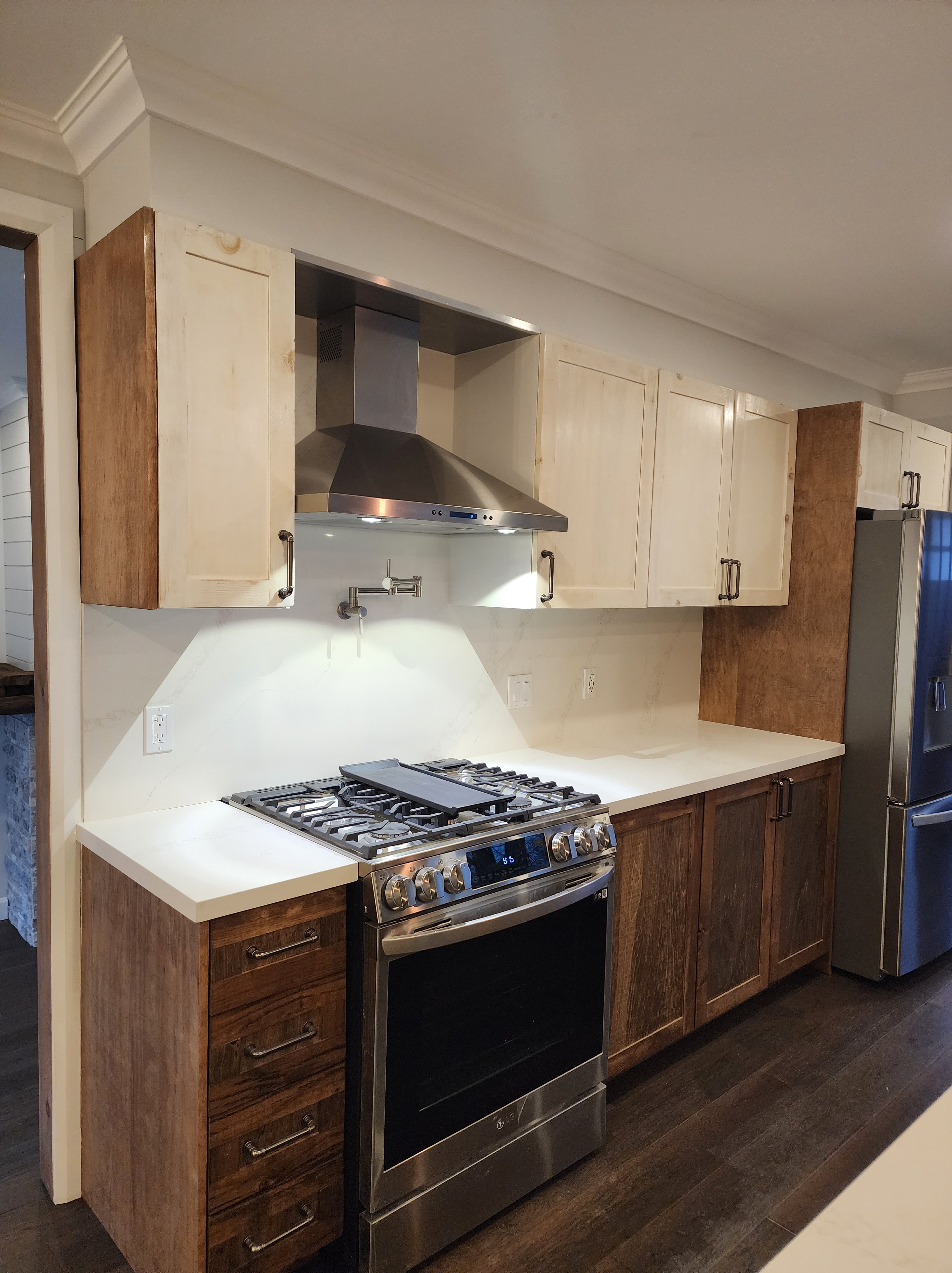 We used stock cabinet boxes and then we crafted, stained and assembled all of the cabinet doors, drawers and drawer fronts, panels, fillers and toe kicks. He had gorgeous quartz counters and a solid quartz backsplash installed.